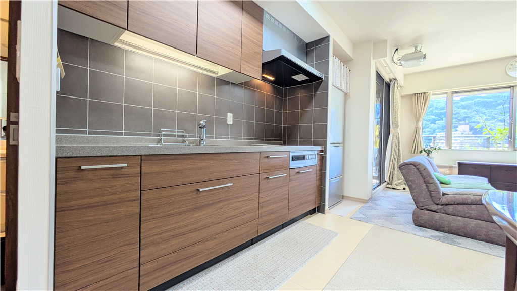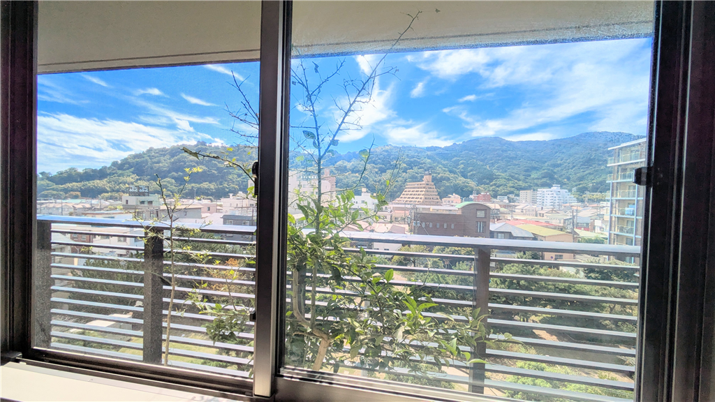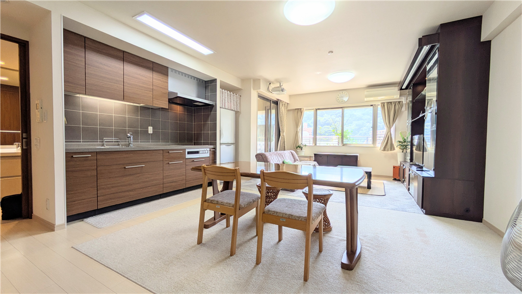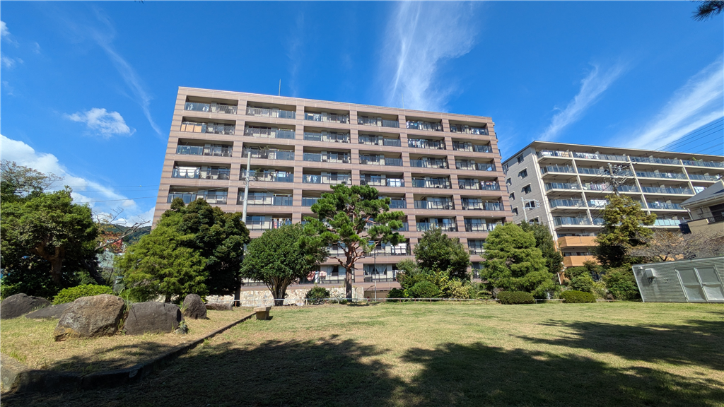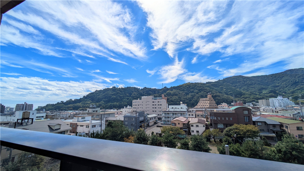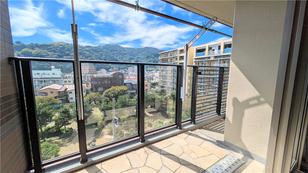 湯河原駅から徒歩約3分(約200m)。LDK、バルコニーからは湯河原の市街地、遠くに山々を望むことができます。