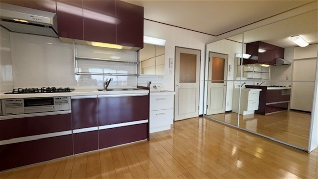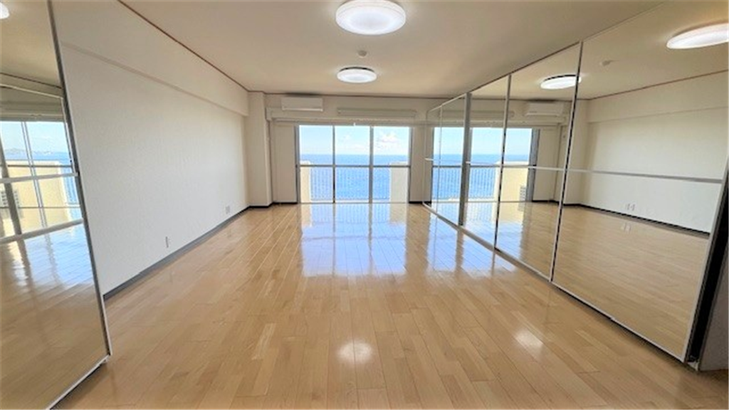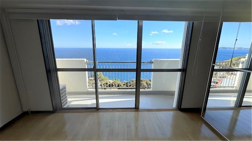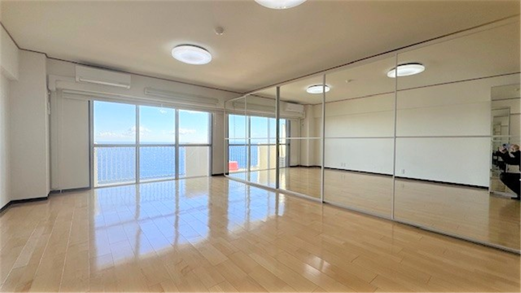 初島、伊豆大島が見えます。大きなミラー張収納により視覚的に広く見える住戸です。