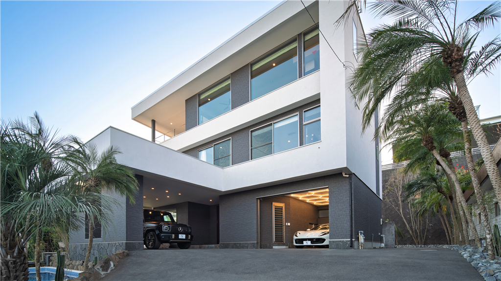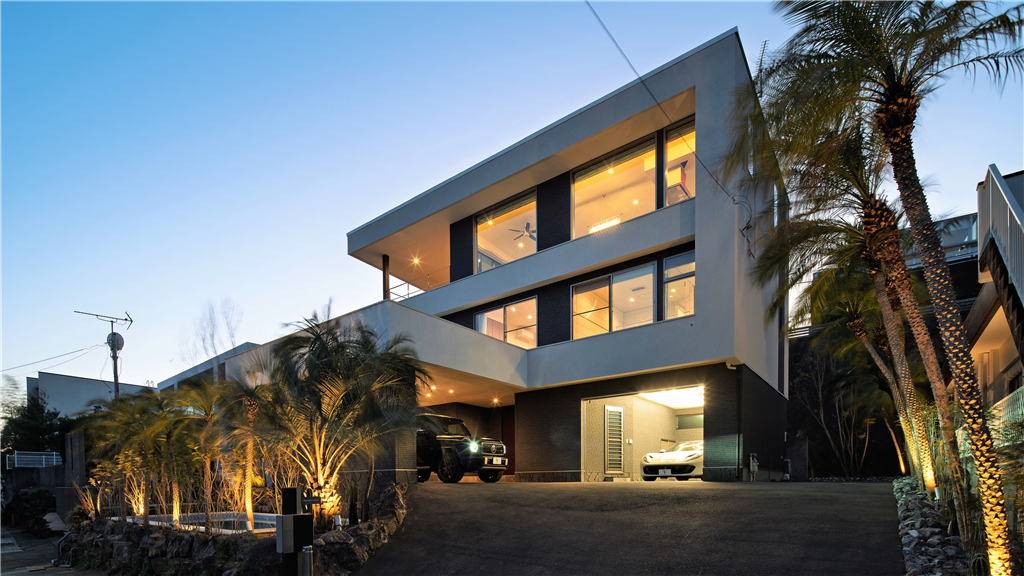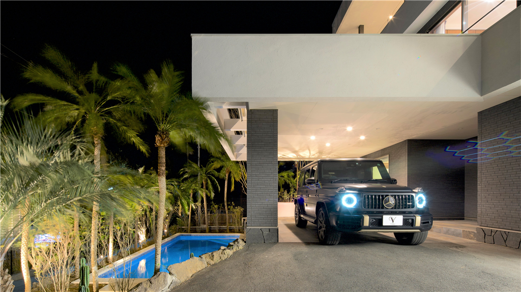 軽量電動シャッター付のビルトインガレージ、ルーフのあるカーポート、ホームエレベーター付。