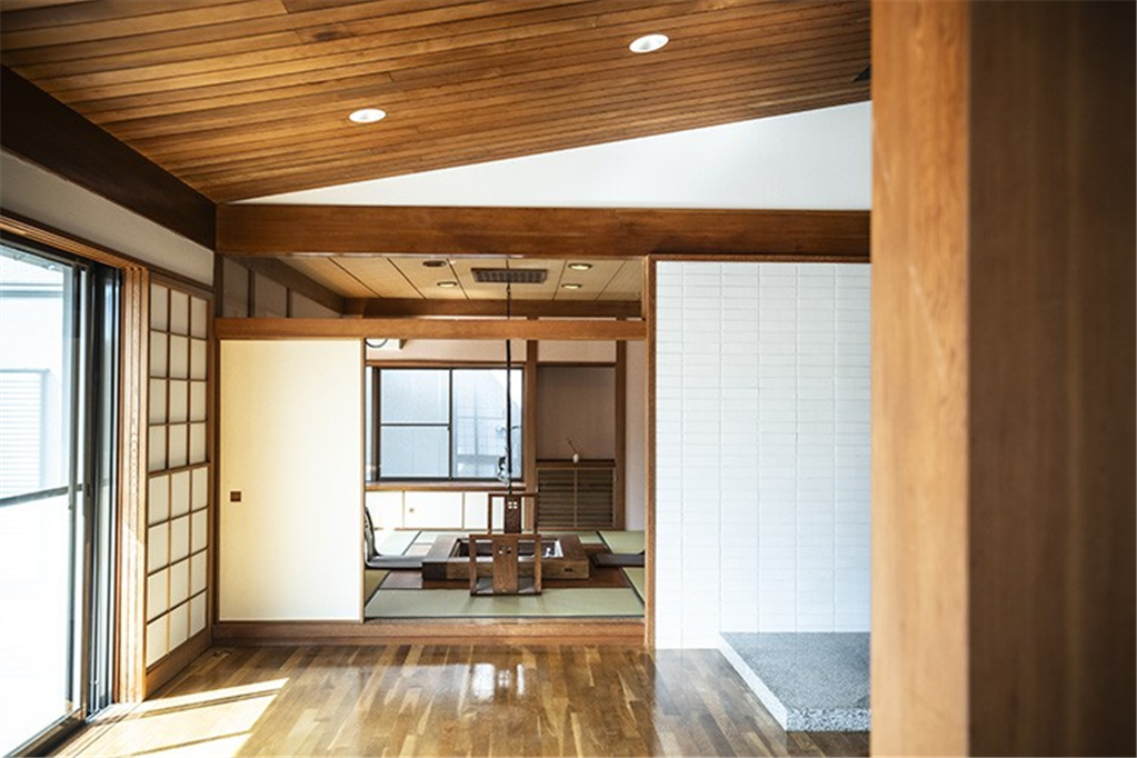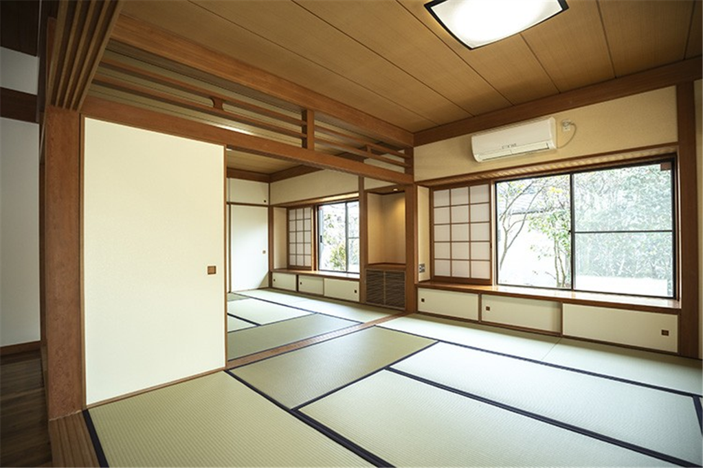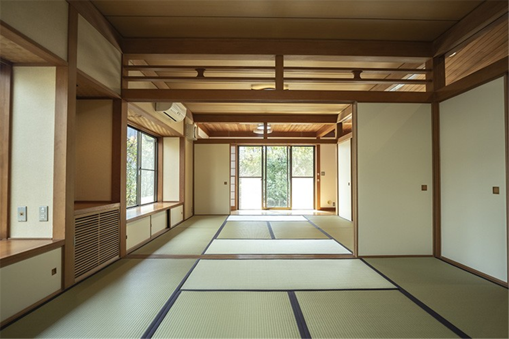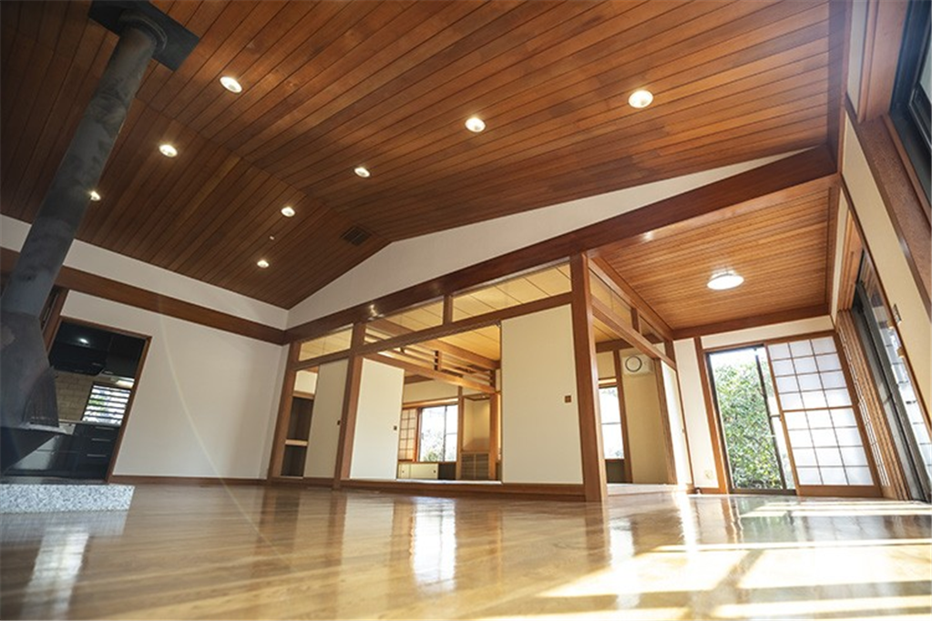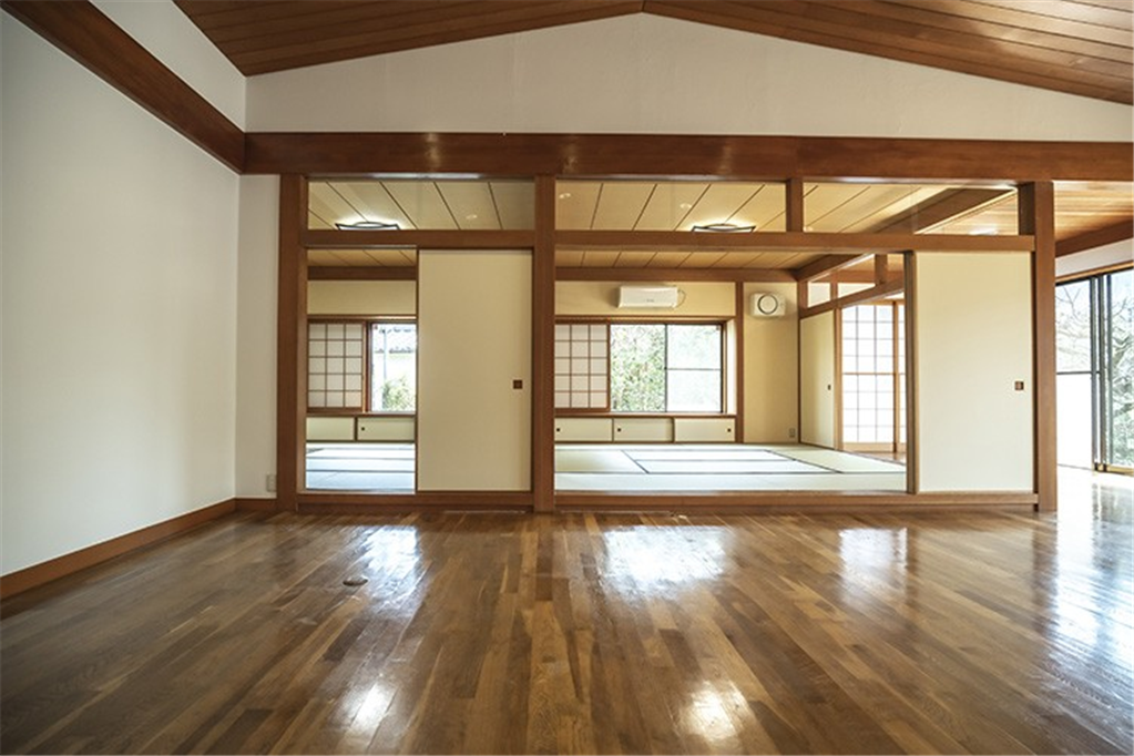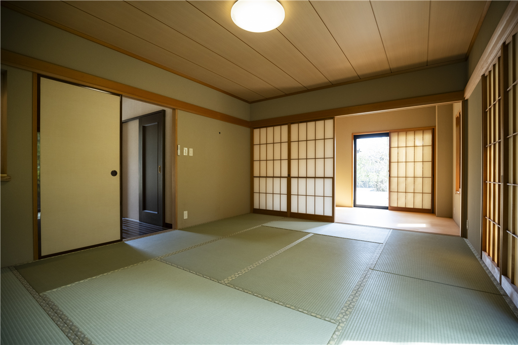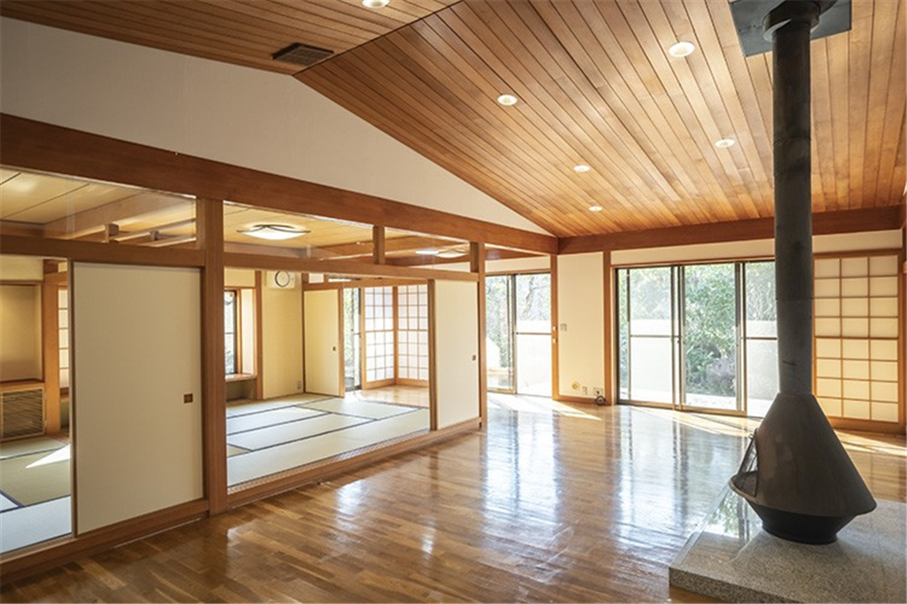 奥湯河原の緑豊かな万葉郷別荘地。高台から湯河原の街並みを遠望し、四季折々の変化を愉しめます。勾配天井で広々としたリビングダイニングは、和室の扉を開放し、約40畳以上の大規模宴会場などにご活用頂けます。大人数で集まる憩いの場にもおすすめです。