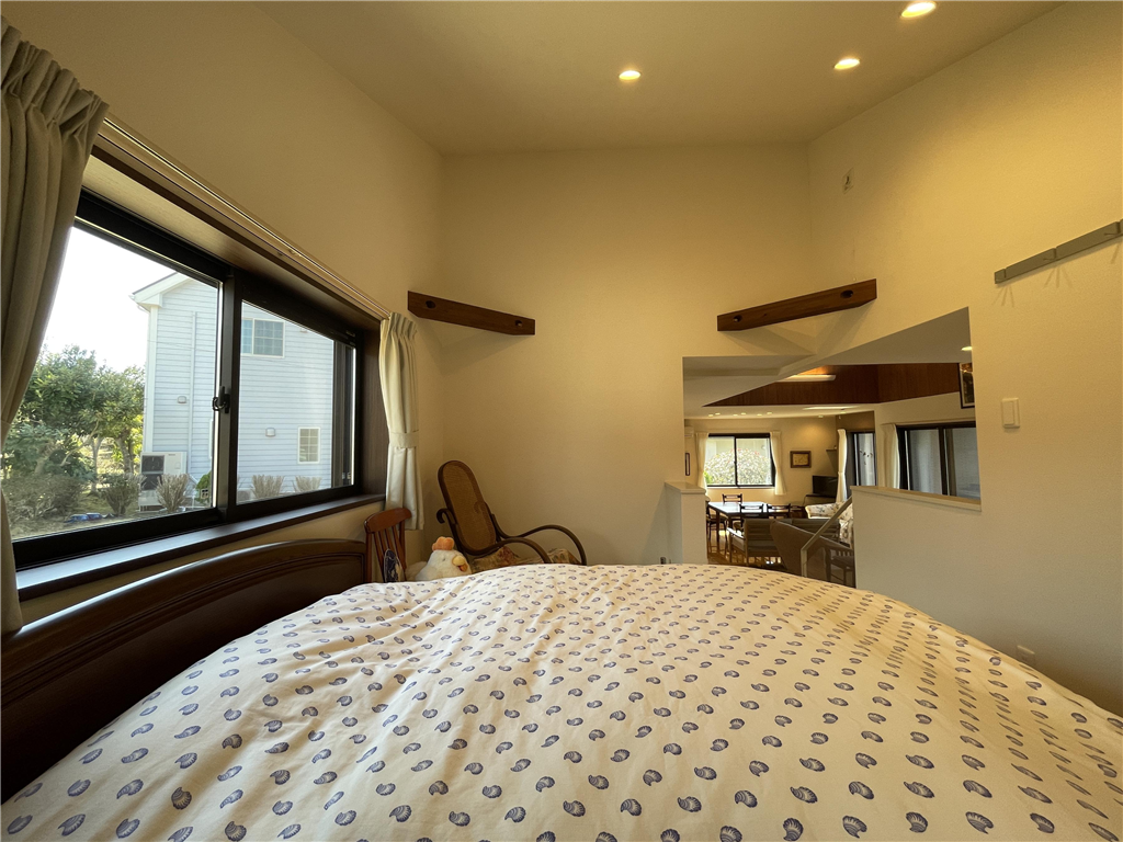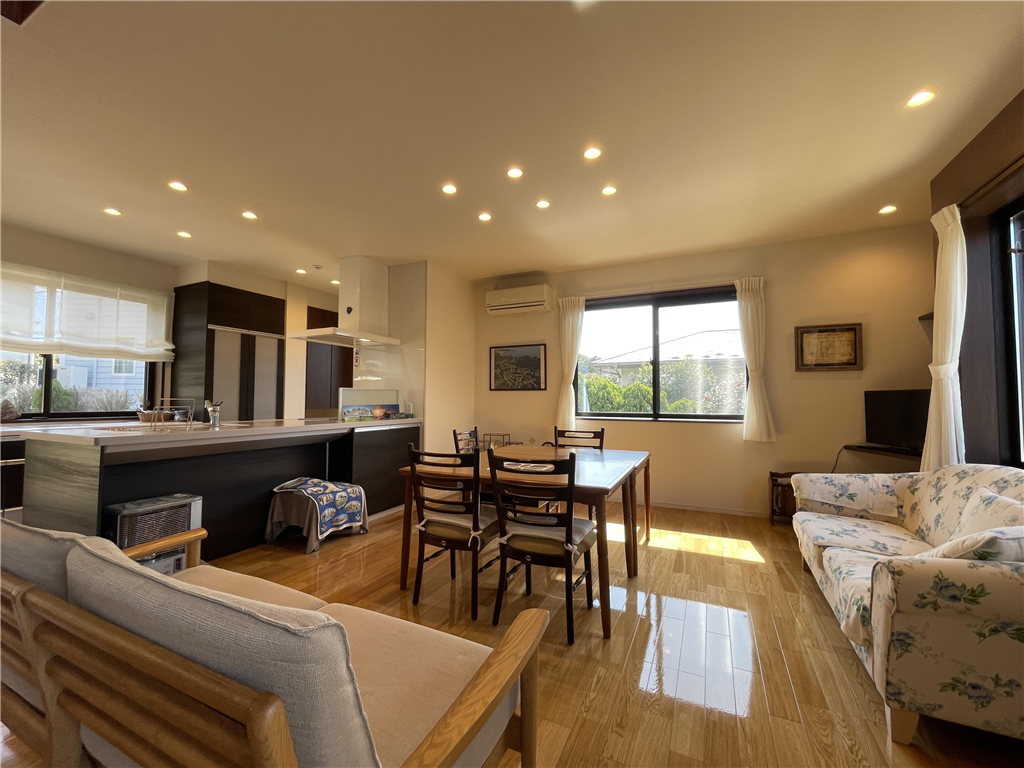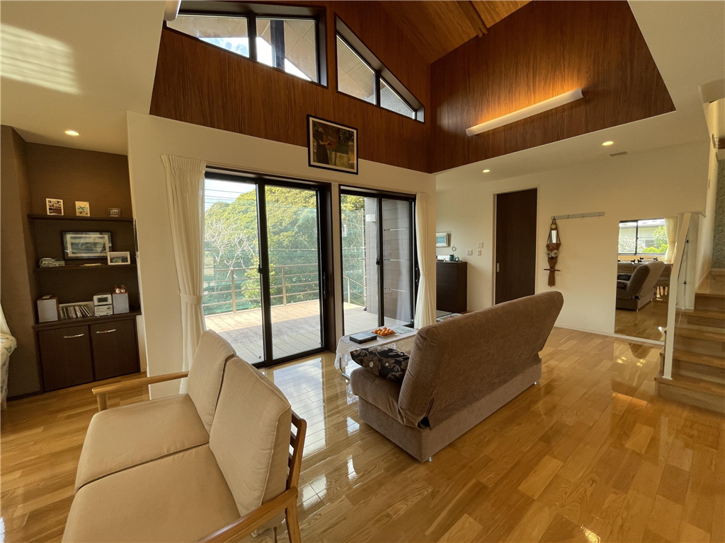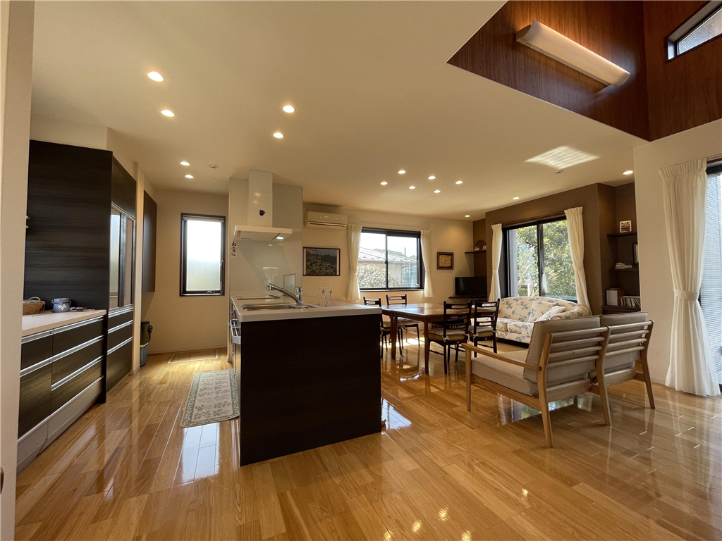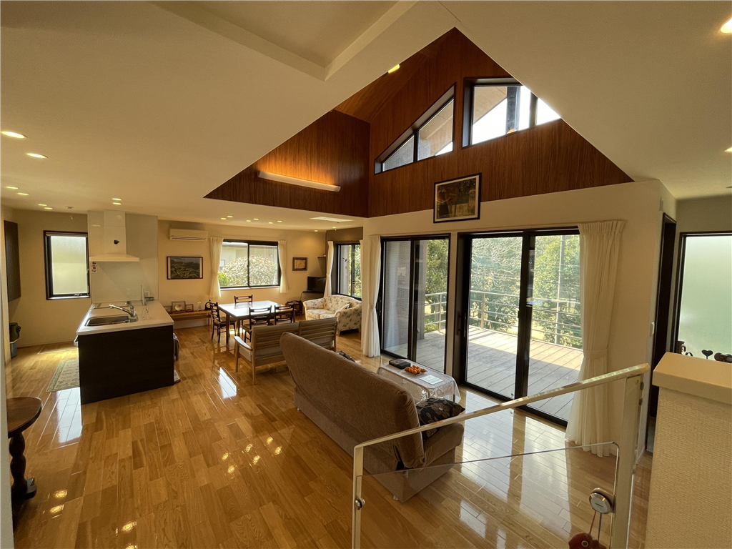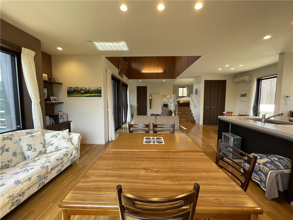勾配天井の室内は明るく開放感があります。平家建てならではの快適な動線と、LDKから樹木の向こうに望むゴルフコースが非日常の優雅さを添えます。景色・環境・住み心地の三拍子が揃った住まいです。
