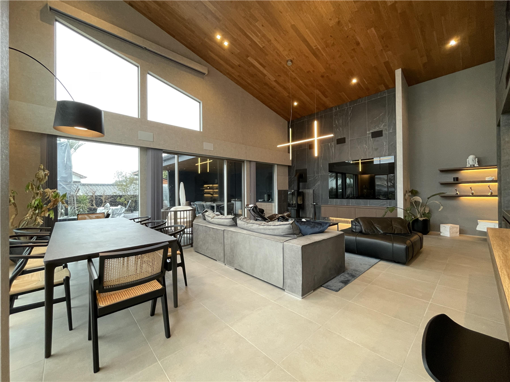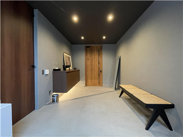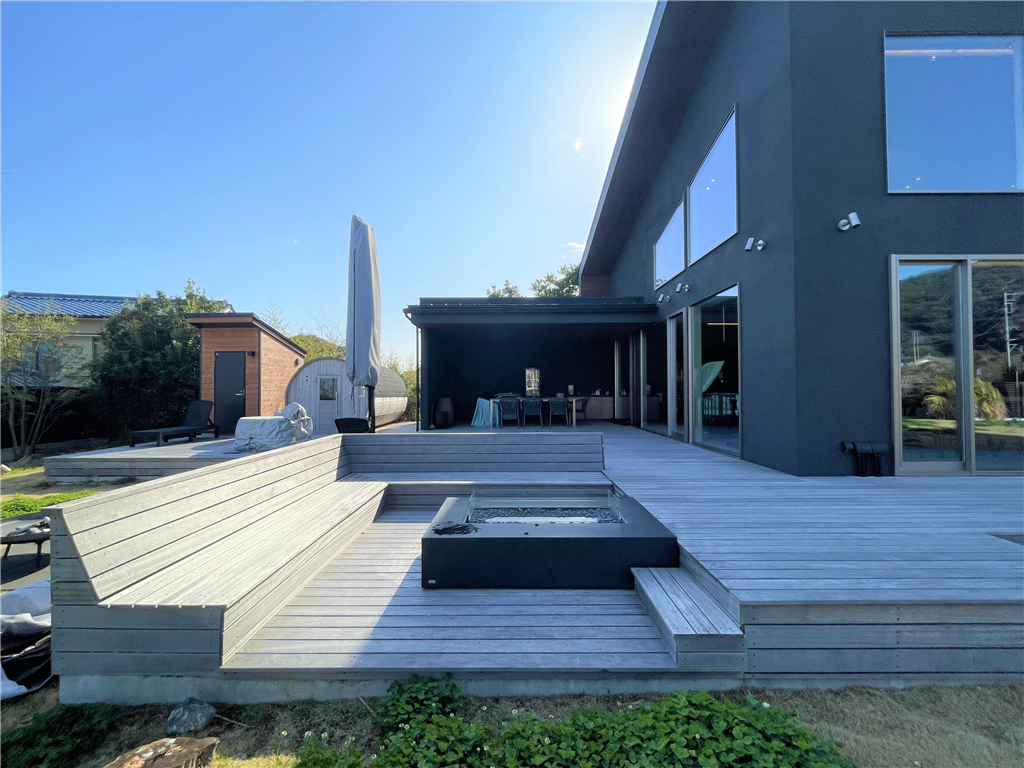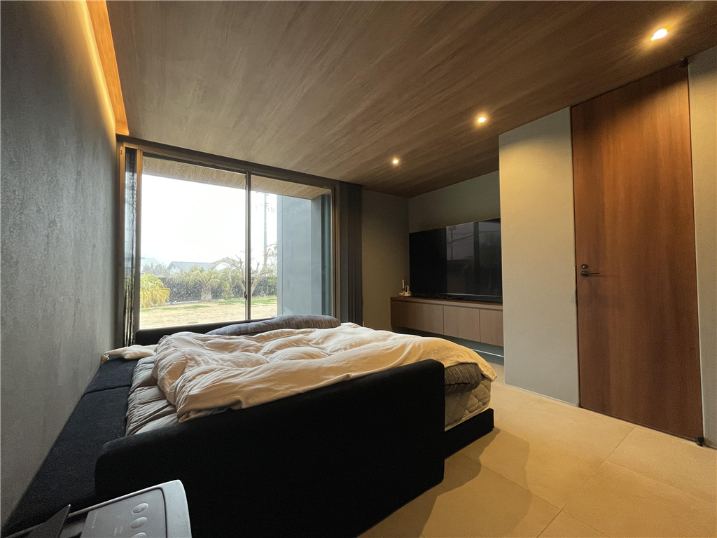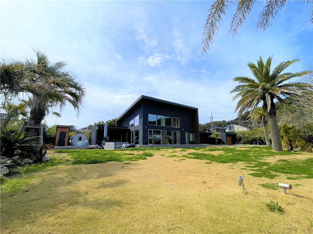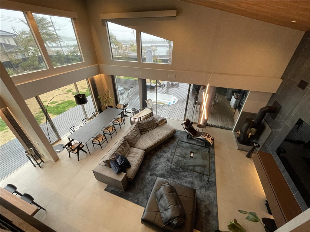 This detached house stands in a seaside resort area. Its monochrome design is coordinated with a high-quality lighting plan. Also, it has a lawn that your dog will love, allowing you to spend a luxurious and extraordinary time.