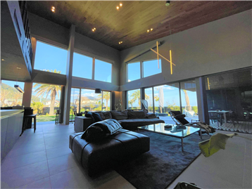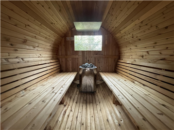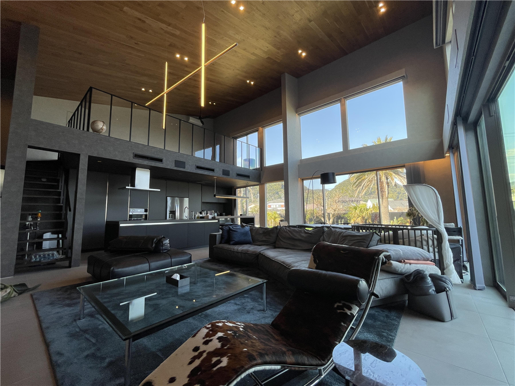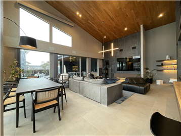 The open living room is designed with a single-pitch roof and ceiling height of approximately 4.6 to 6.4 meters. This resort house is equipped with a jacuzzi and sauna on the deck.