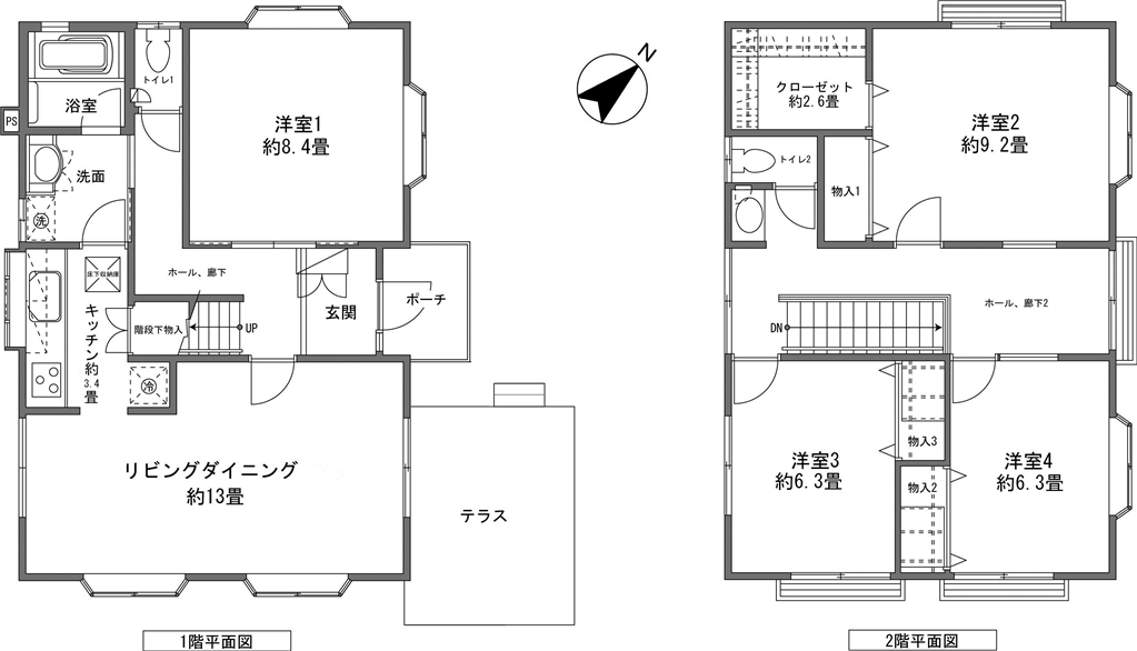 The first floor has a living/dining room of approximately 13 tatami mats and a bedroom of approximately 8.4 tatami mats, and the second floor has another bedroom (approximately 9.2 tatami mats) with a closet of approximately 2.6 tatami mats, and other 2 bedrooms (each approximately 6.3 tatami mats).It is a 4-bedroom property that is also recommended for those considering settling down!