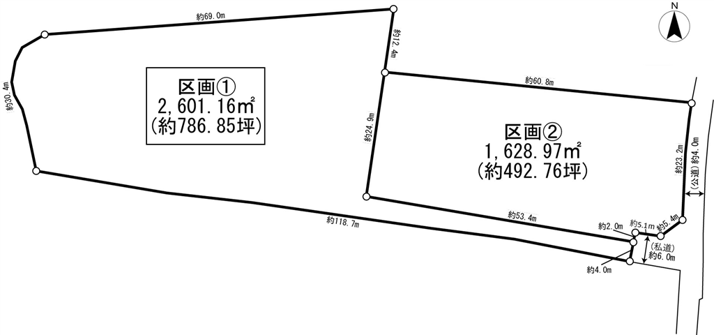 | Notes | *Plot 2: 1,628.97 sqm (approximately 492.76 tsubo), can be purchased together for 218 million yen. The total for the two plots is 4,297 sqm (approximately 1,299.84 tsubo), 536 million yen. *In the case of a bulk purchase, if you are making changes to the zoning or characteristics of land for the purpose of constructing a building or specific structure on land of 3,000 sqm or more, you will need to file a development action notification. | |