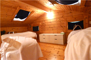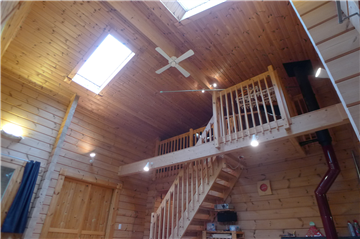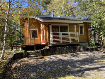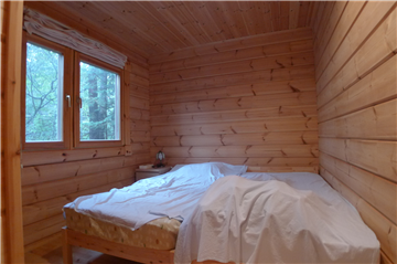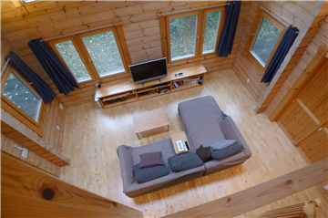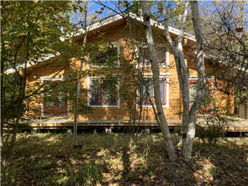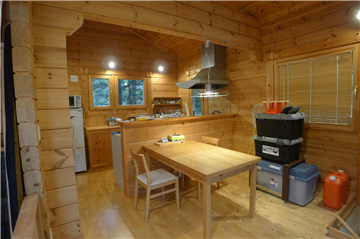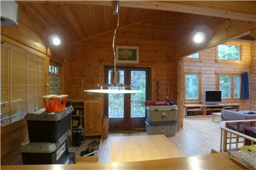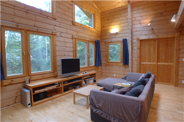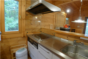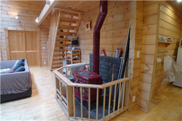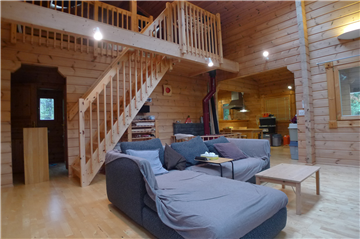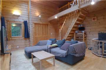 A detached house (HONKA Log) with 2BR + loft surrounded by trees. A wood stove is installed in the Living/ Dining/ Kitchen area.