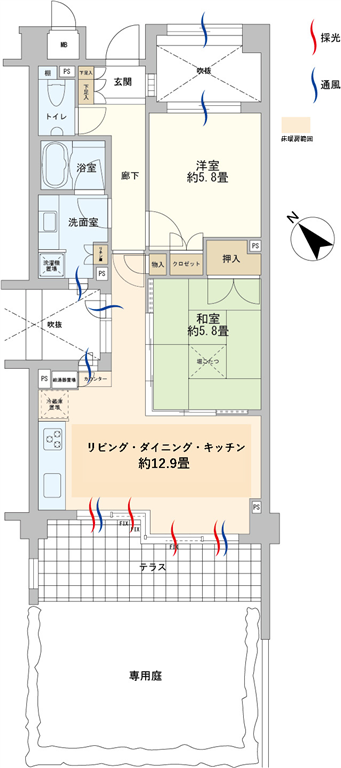 専用庭の先には木立が広がり涼やかな風が通ります。和室には堀コタツがあり、リビングダイニングの床暖房と合わせて寒い日にも暖かくお過ごし頂けます。吹抜スぺ―スにも開口があるため、換気にも優れた住戸です。