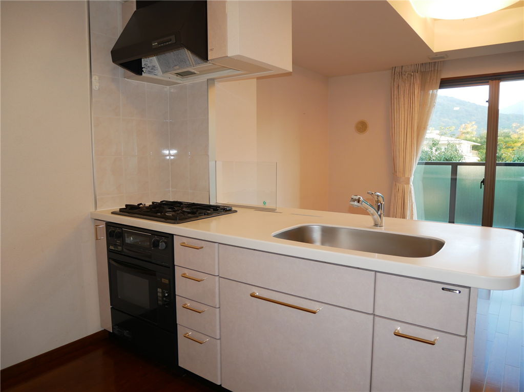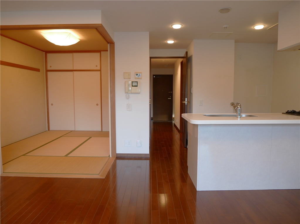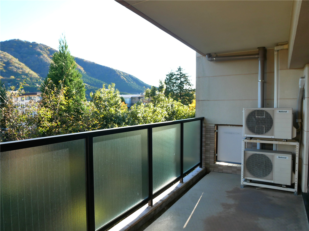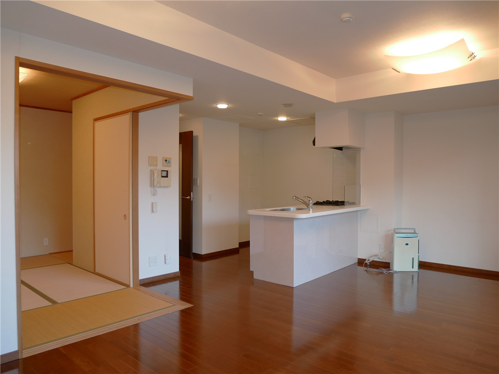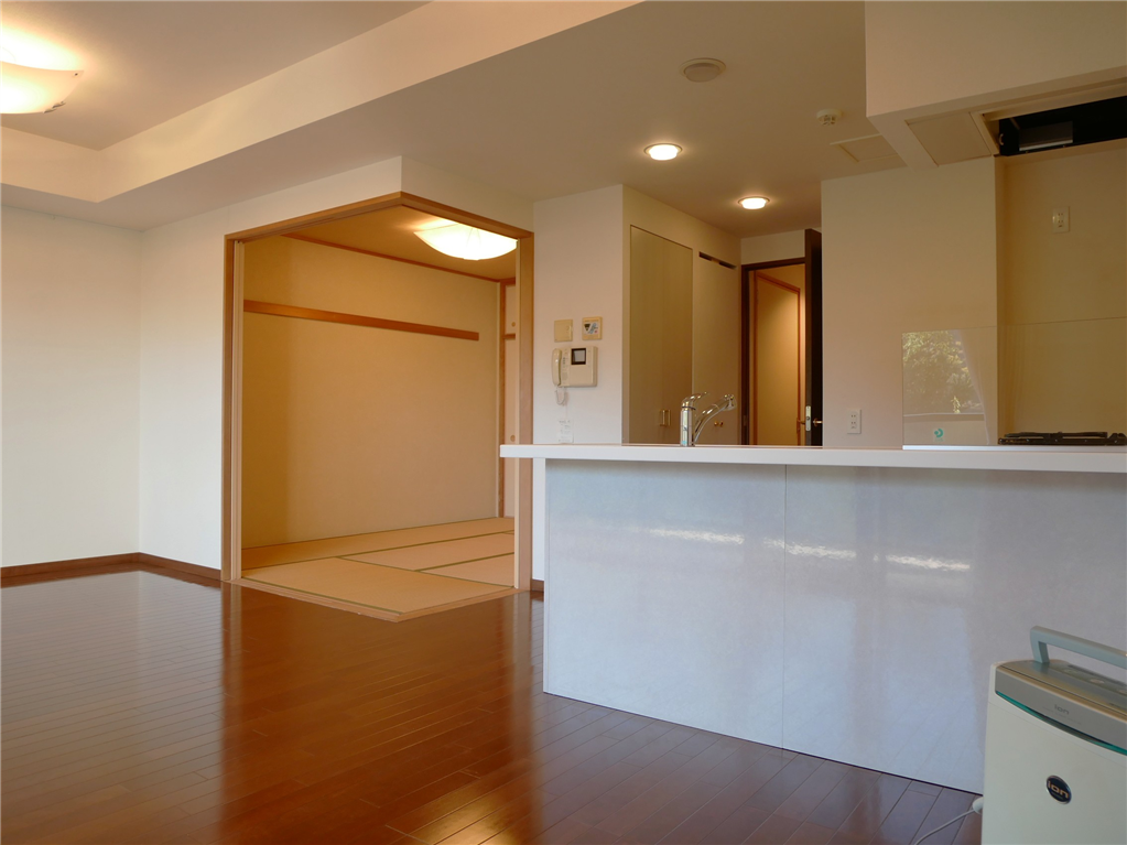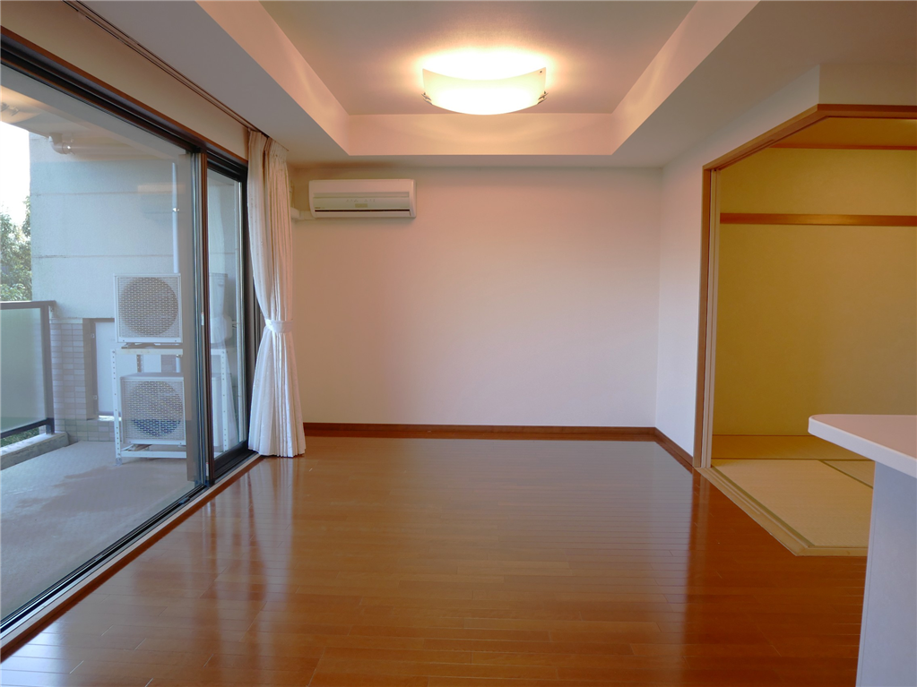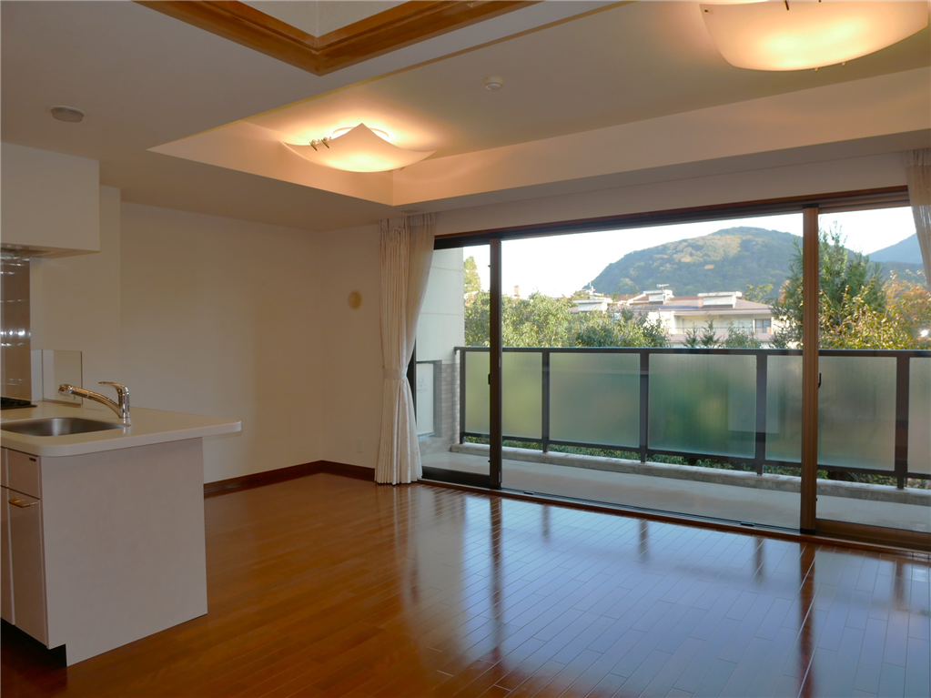 LDKのハイサッシにより四季折々の箱根外輪山の眺望をお愉しみになれます。LDKに隣接する和室の襖を開けると一体感のある広々とした室内空間で利用できます。和室は廊下への動線も確保しており、多機能に活用できるレイアウトです。