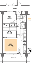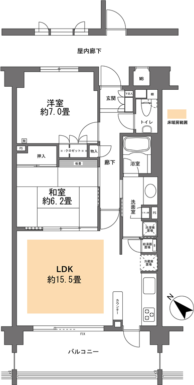 床暖房付きで快適に寛げる約15.5畳のLDK。バルコニーはキッチンからも出入りできる便利な動線です。和室(約6.2畳)、洋室(約7畳)の2LDK住戸です。