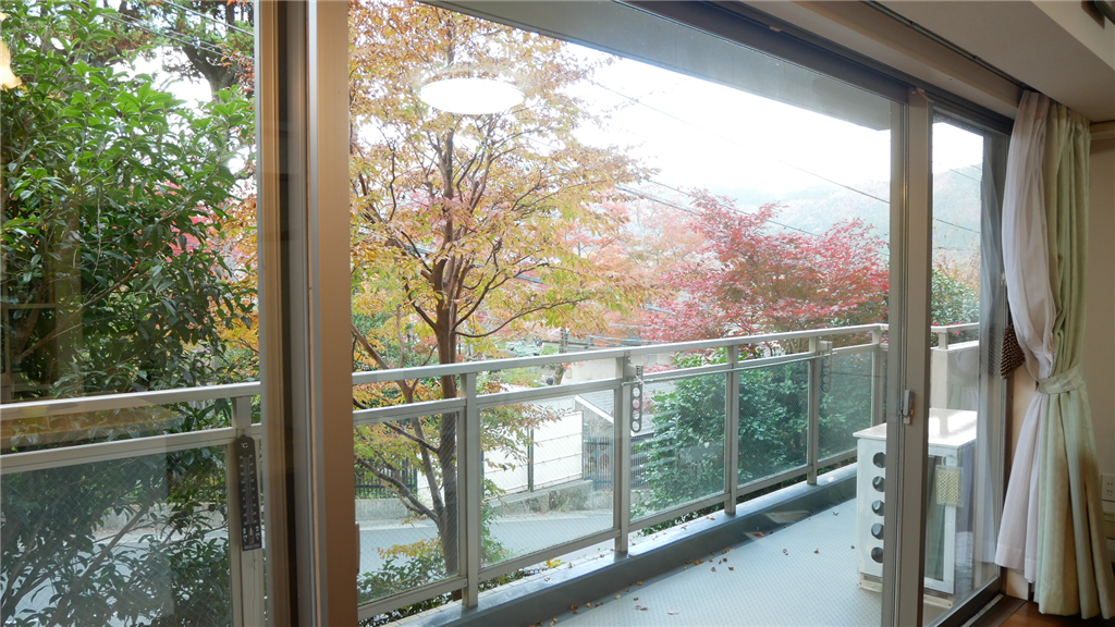 ガラス手摺のバルコニーに面したリビングからは四季折々の箱根外輪山を望める2LDK住戸。