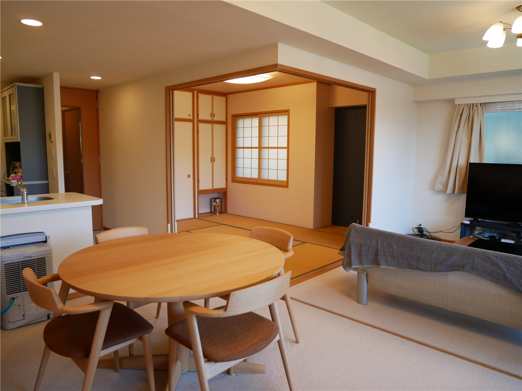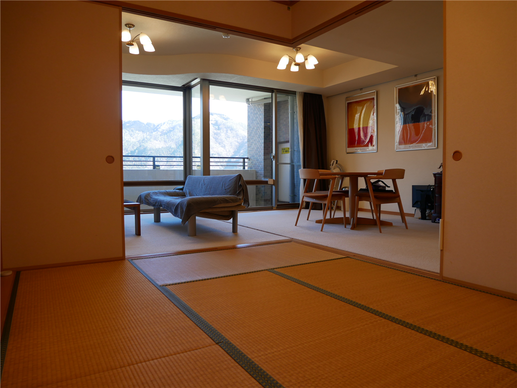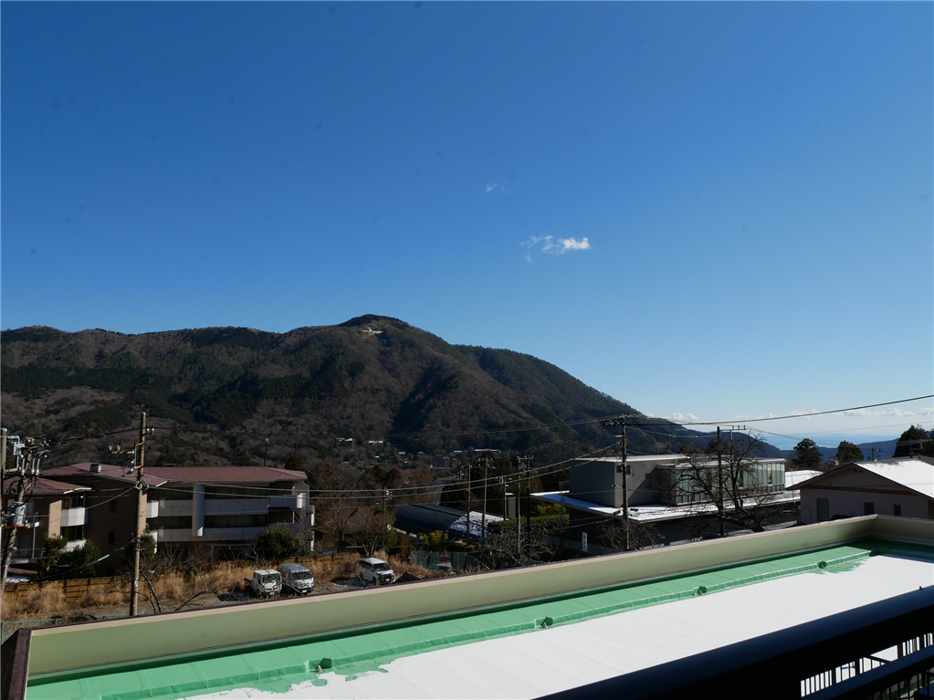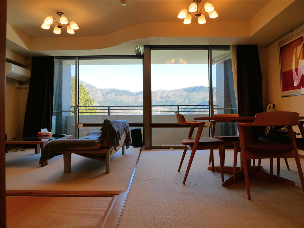 LDKは2面開口で通風に優れ、コーナーサッシにより四季折々の箱根外輪山眺望をご覧になれます。洋室からは洗面室、浴室へ直接行くことができる便利な動線です。サウナ付き温泉浴場・露天風呂は和の趣があります。