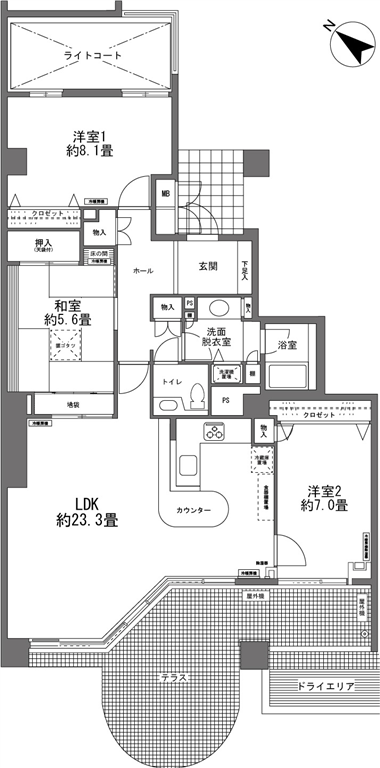 テラスに面したLDKと洋室2が開放的で、ゆったりとした105.66m2のお部屋です。
