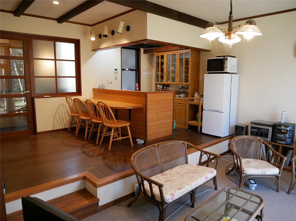 お部屋はリビングからダイニングキッチンへスキップフロアで繋がり、テラス先の四季折々の景観が広がる開放感のある室内空間です。