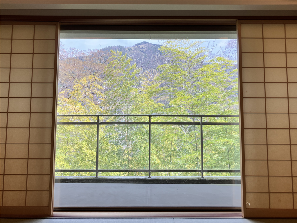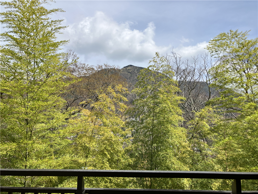 バルコニーからだけではなく、リビングからも緑豊かな箱根外輪山の眺望を愉しめます。リビングは畳敷きでゆったりとお寛ぎいただけ、独立した洋室もある1LDKです。強羅駅から徒歩約4分(約320m)とアクセスも良好です。