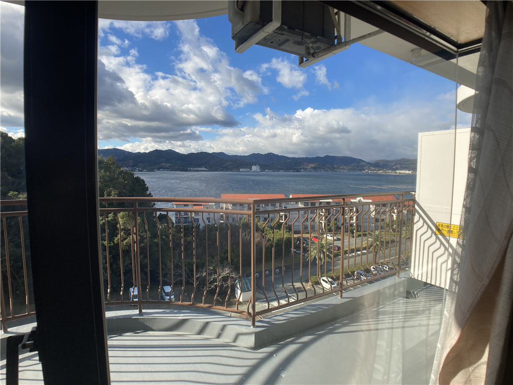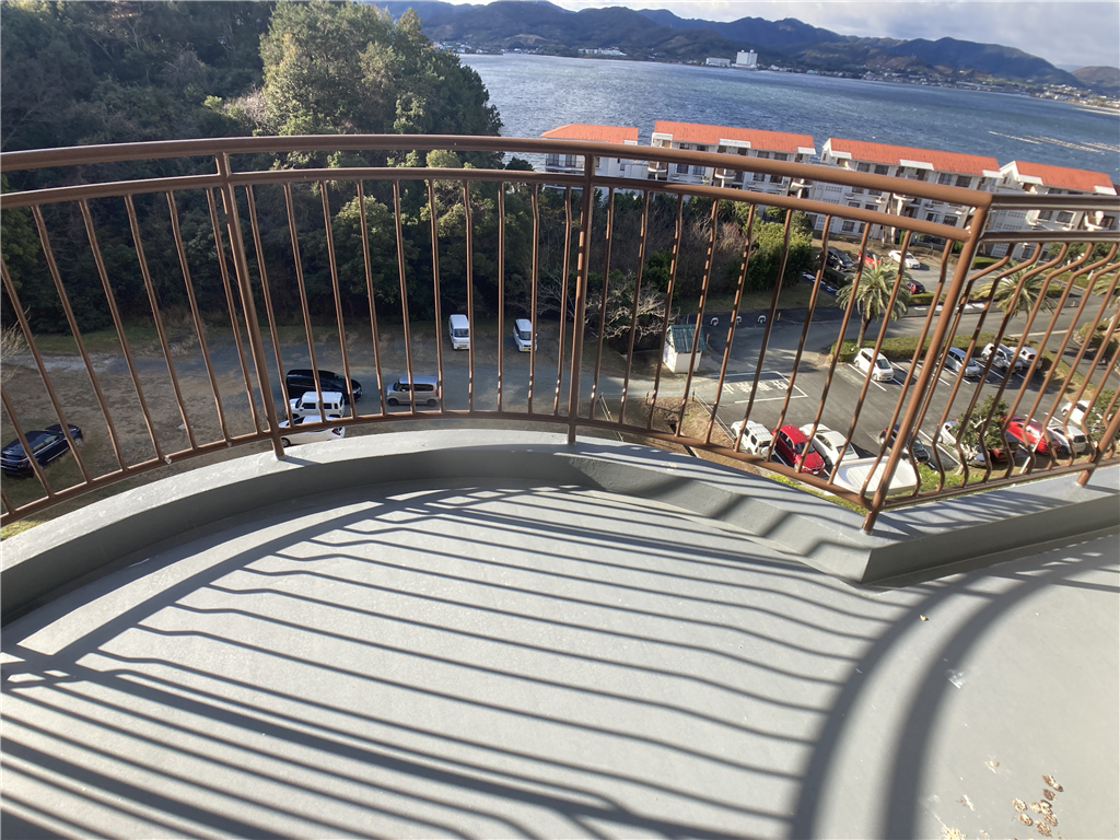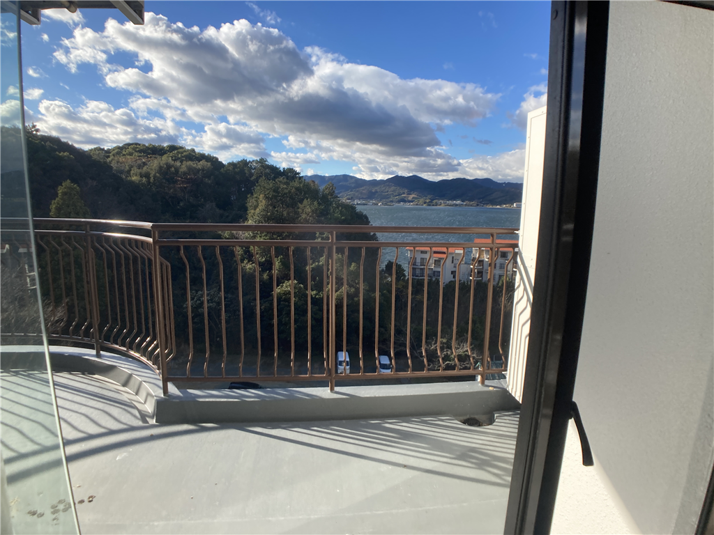バルコニーから眼下に猪鼻湖を見下ろす6階・1LDK