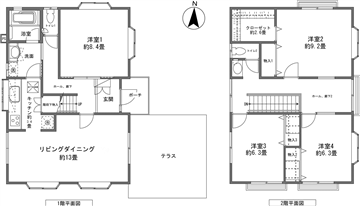 1階に約13畳のLDと約8.4畳の洋室1、2階に約2.6畳のクローゼット付の洋室2(約9.2畳)、洋室3,4(各約6.3畳)の4LDKの間取りで、定住でご検討の方にもおすすめの物件です!