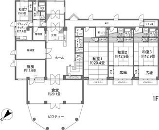 - 間取り:6R(客室)+1DK+管理室+食堂+厨房+フリースペース+(別棟)倉庫