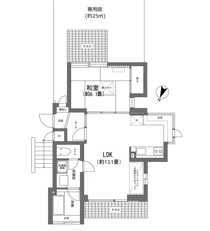 上段折たたみ式ベッド付きのLDKに一体利用可能な和室が付く1LDKのお部屋です。和室側のテラスには約25m2の専用庭があり、テーブルセットを出し緑を眺めながらのんびりとお寛ぎください。