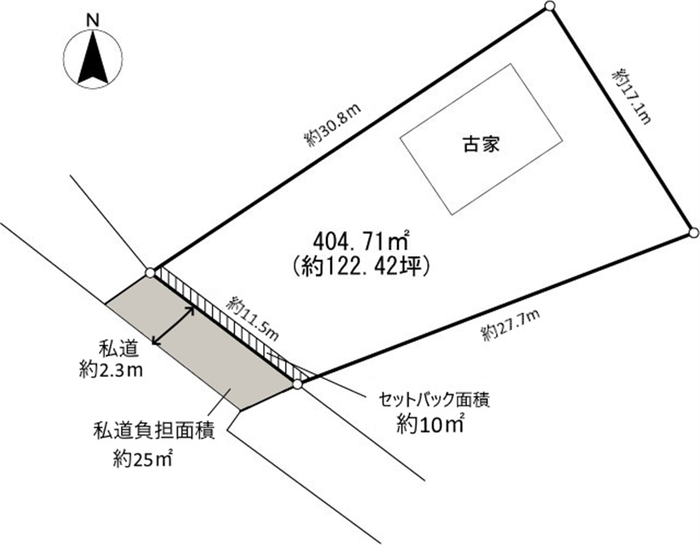 面積 | (公簿)404.71m2(122.42坪) 私道面積(別途負担)/25m2(公簿) | |