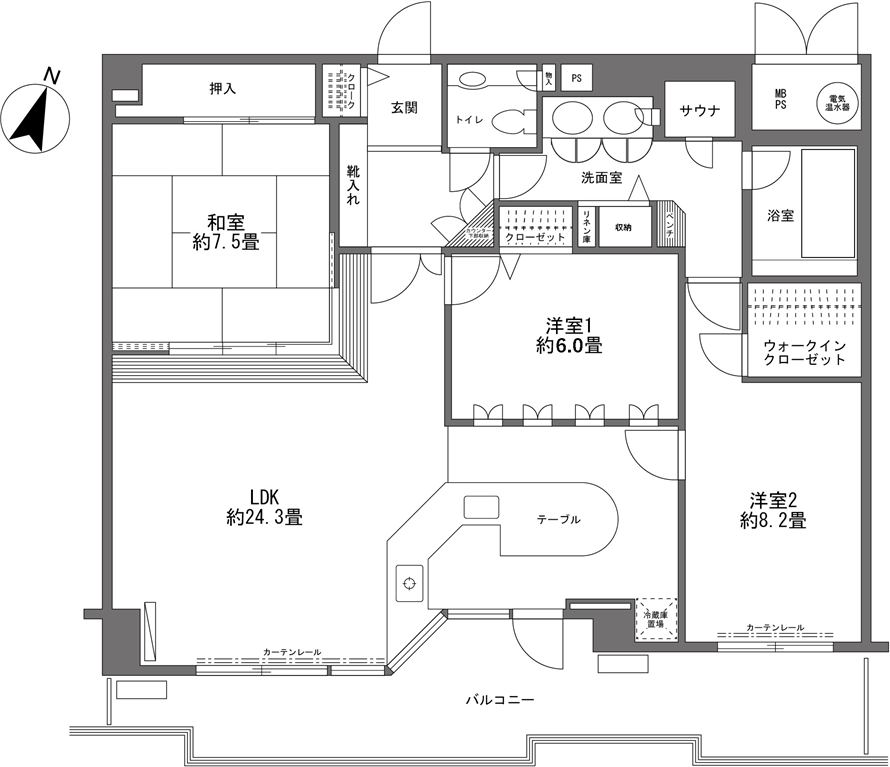 採光豊かな南東向きの約24.3畳のLDKが特徴のサウナ付き3LDKのお部屋です。