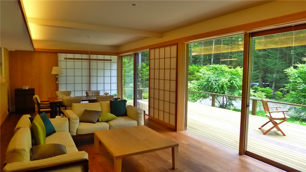 旧軽井沢銀座まで徒歩約12分(約900m)、三笠通りと平行した裏通り沿いに立地したプライベート感ある環境です。開放感ある約25.5畳のリビング・ダイニングが特徴の拘りある木造建築です。