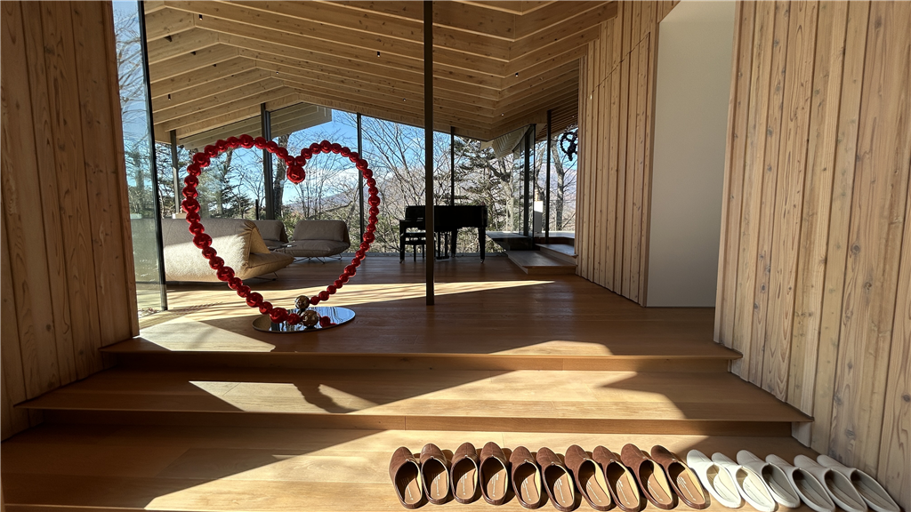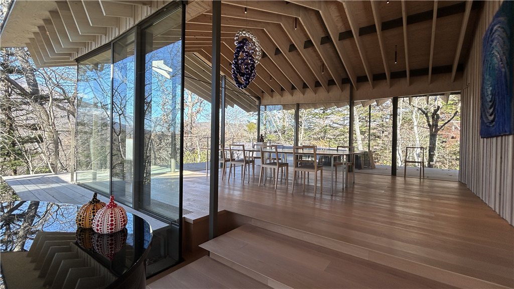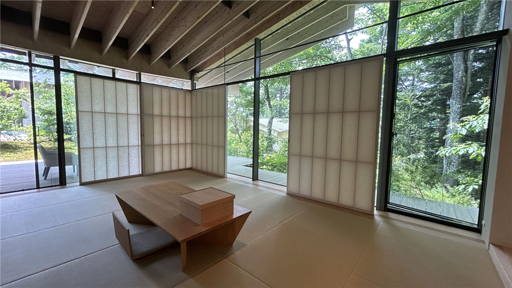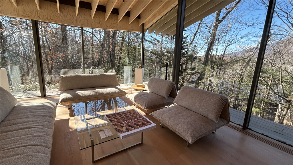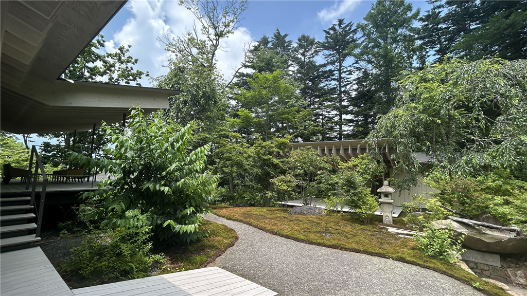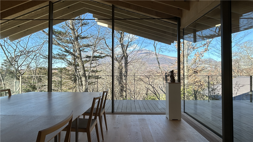 星野リゾート別荘地内、浅間山を望む大浴場付き母屋と別棟3棟から成るゲストハウス。