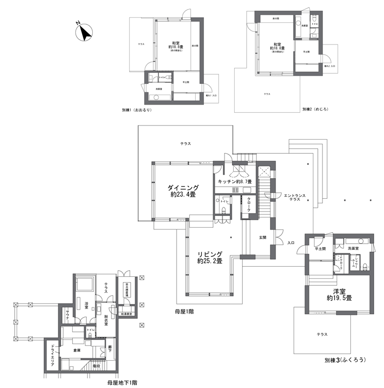 | 備考 | ●別棟:延床面積/(公簿)51.86m2(15.68坪)●別棟2:延床面積/(公簿)48.28m2(14.60坪)●別棟3:延床面積/(公簿)58.93m2(17.82坪) | |