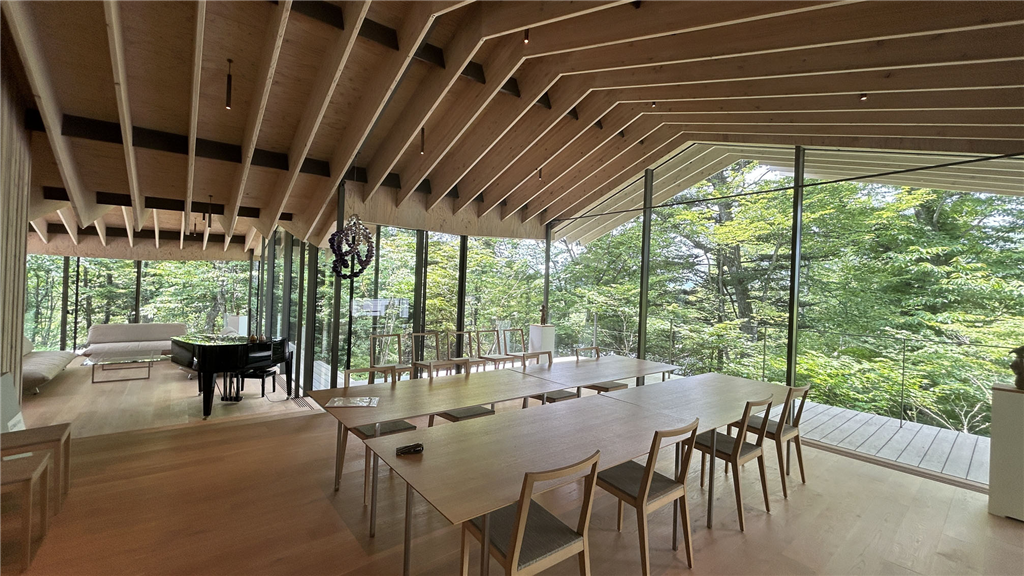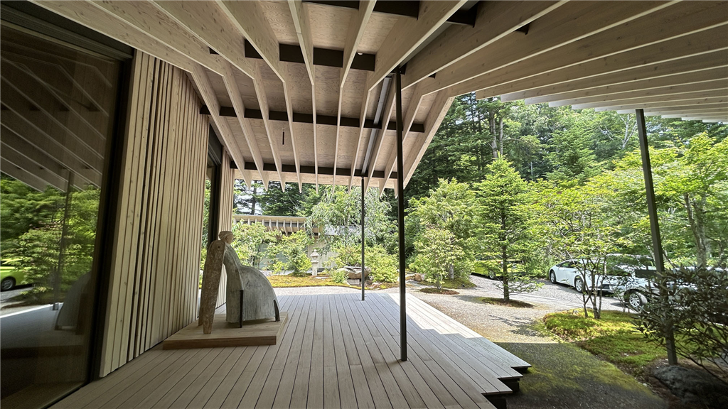 敷地面積約2,464m2(約745坪)の林間に佇み、周囲には湯川の清流沿いに屋外飲食店等の立ち並ぶハルニレテラス(約1.2km・車約3分)や、星野温泉トンボの湯(約800m・徒歩約10分)などのある、中軽井沢の星野リゾート別荘地内の別荘です。