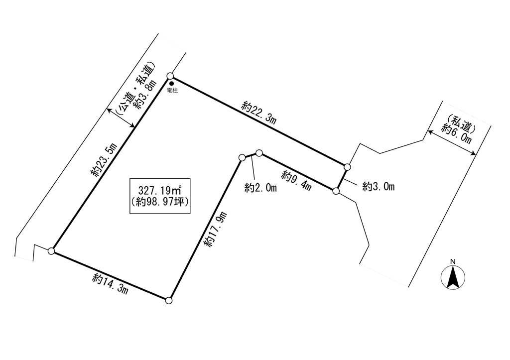 接面道路 | 北西側約3.8m(公道・私道)未舗装、南東側約6.0m(私道)舗装 | |