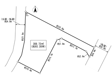 接面道路 | 北西側約4.0m(公道・私道)未舗装、南東側約6.0m(私道)舗装 | |