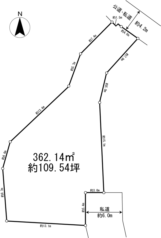 | 接面道路 | 南東側約6.0m(私道)舗装、北側約4.2m(公道・私道)舗装 | |