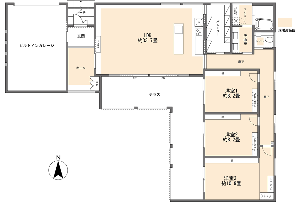 【新築・2025年7月完成】3LDK+ビルトインガレージ付き、全室床暖房完備の平家建。