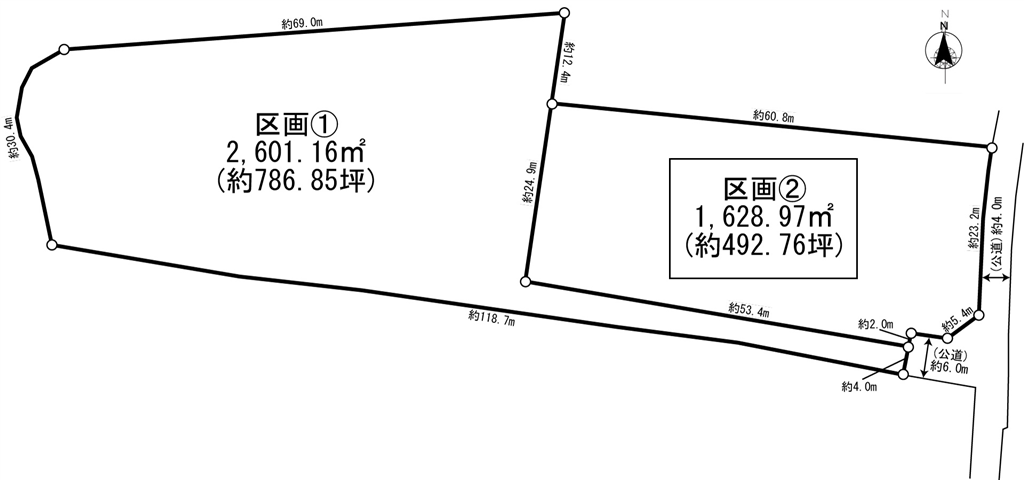 | 注記 | ◆ ※区画1 2,601.16m2(約786.85坪)3億1800万円と一括売買可能です。2区画合計4,297m2(約1,299.84坪坪)5億3,600万円。 ※一括売買の場合、3,000m2以上の土地において、建築物の建築又は特定工作物の建設の用に供する目的で行う土地の区画・形質の変更を行う場合は開発行為届出が必要となります。 |
