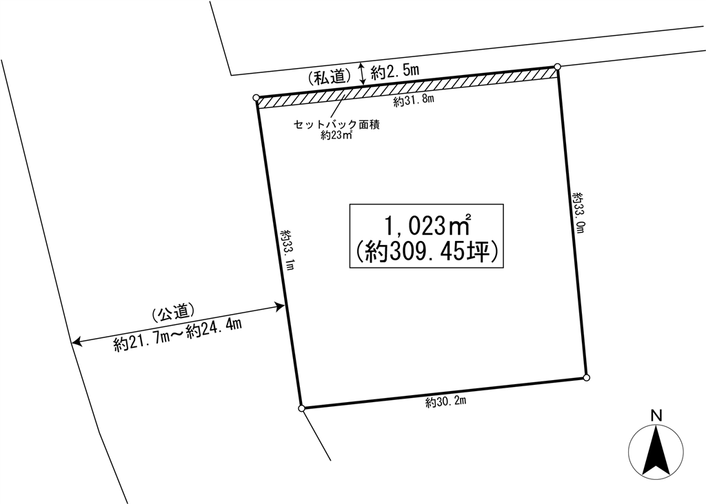 | 接面道路 | 西側(公道)舗装(約21.7m~約24.4m)、北側(私道)未舗装(約2.5m) | |