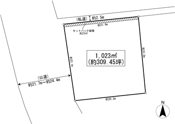 | セットバック有 | 約23m2(※セットバック面積については、公図縮尺による概算面積として表記しているため、建築確認申請時の面積とは異なる場合があります。) | |