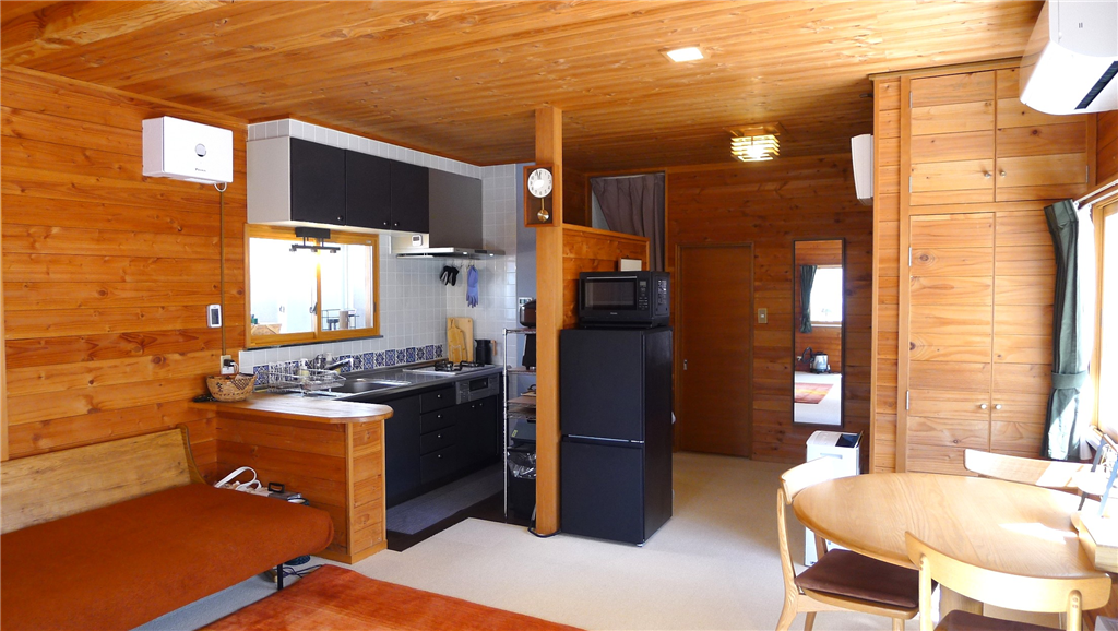 リビングの板張りの内装がリゾート感を演出する2LDKの一戸建てです。