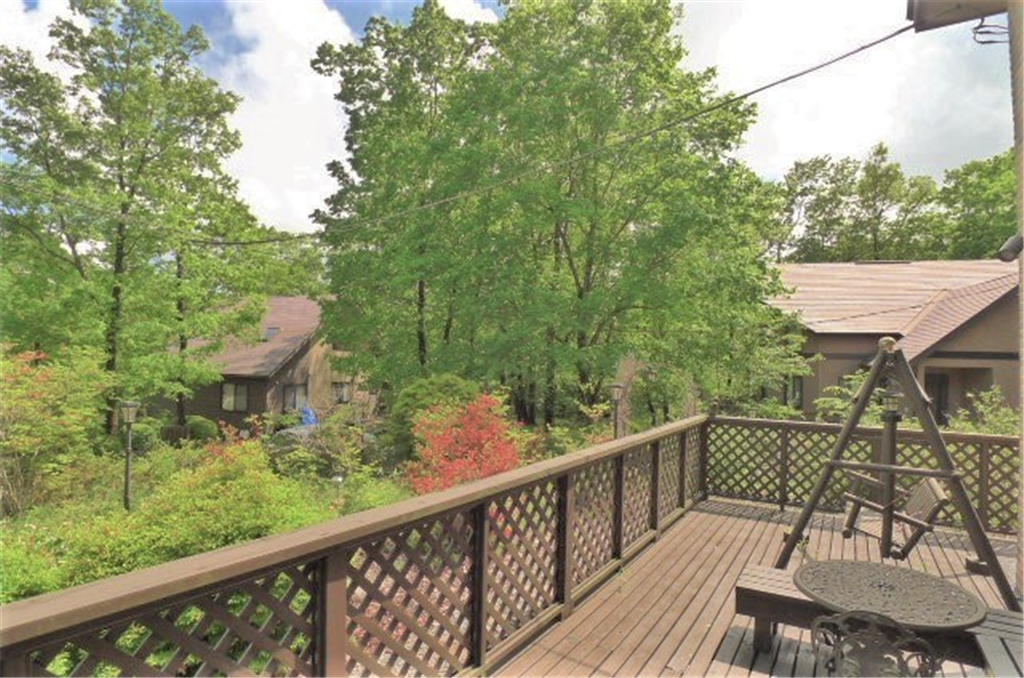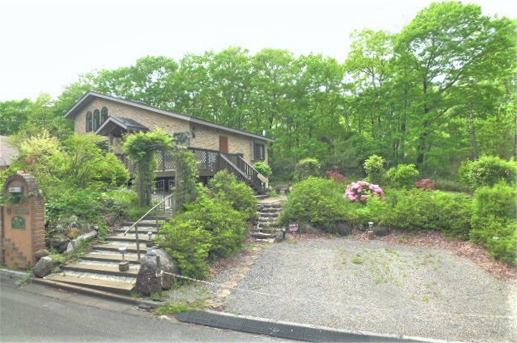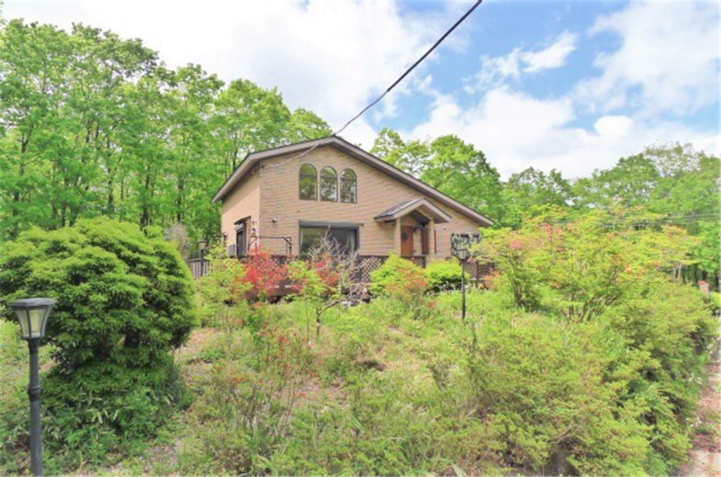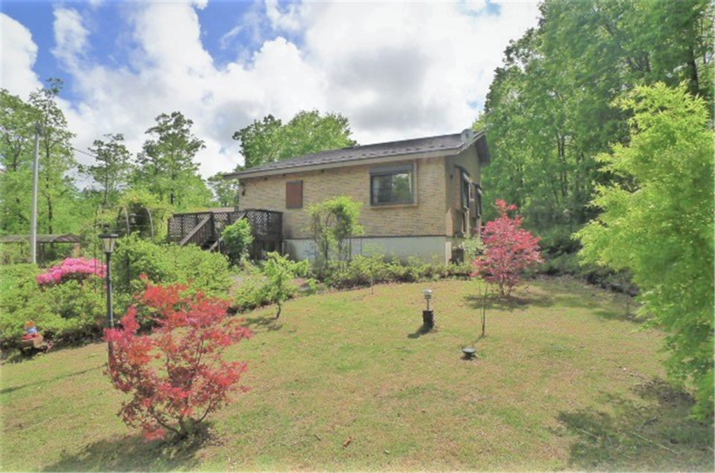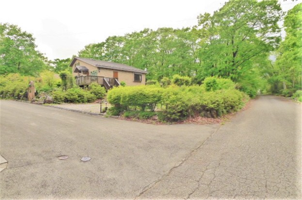 北東・南東側二面接面道路の角地。緑豊かで平坦な敷地に建つ、平家建の一戸建別荘。