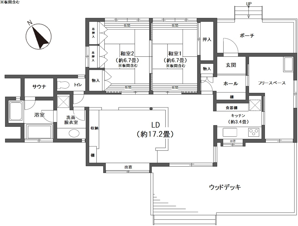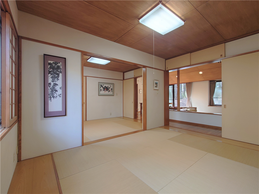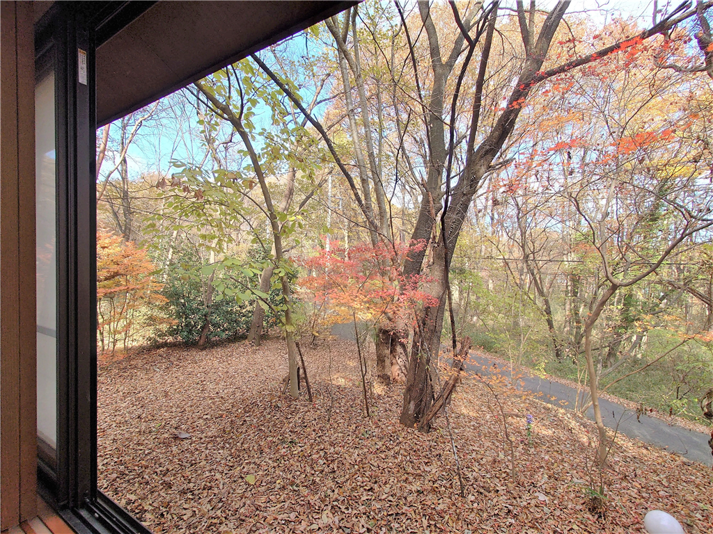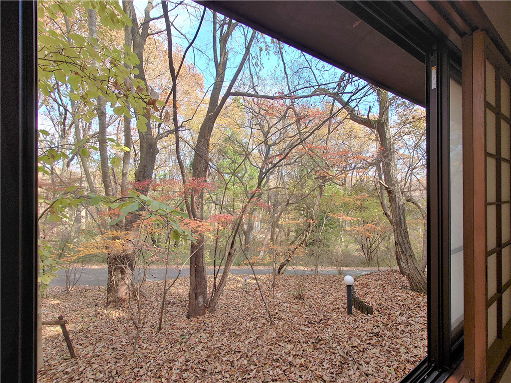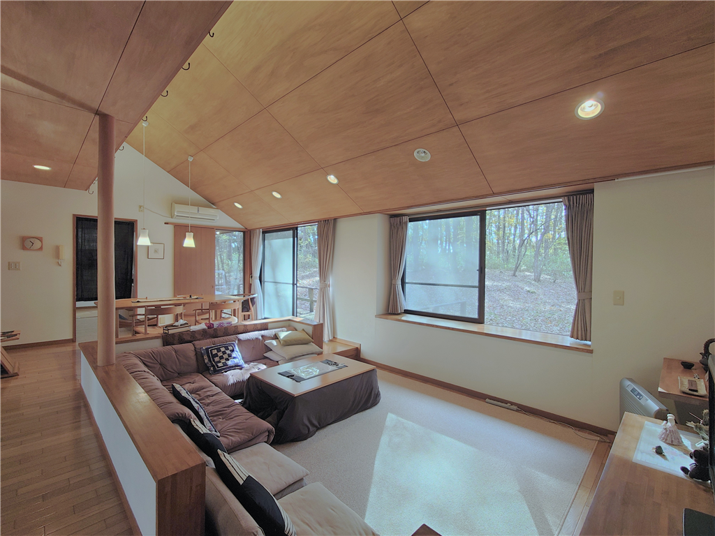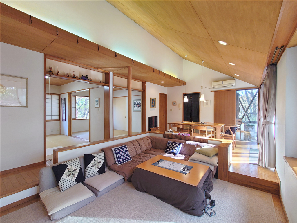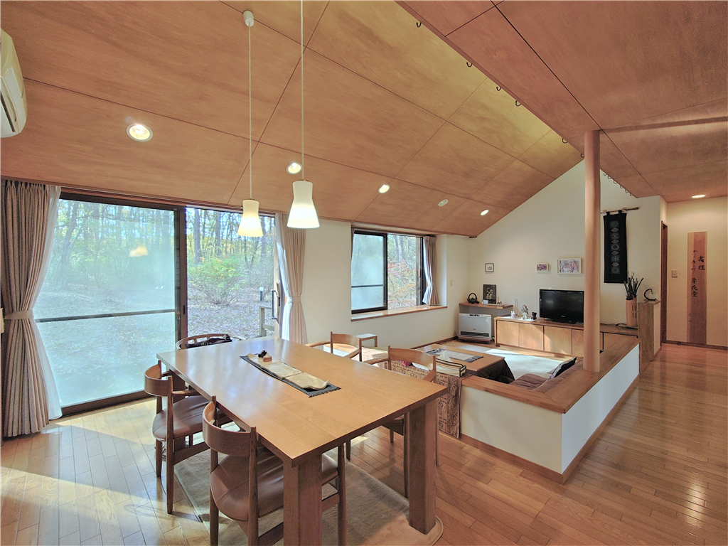 自然豊かな敷地に建ち、LDよりデッキ越しに四季折々の風景を愉しむ木造建築の平家建て。