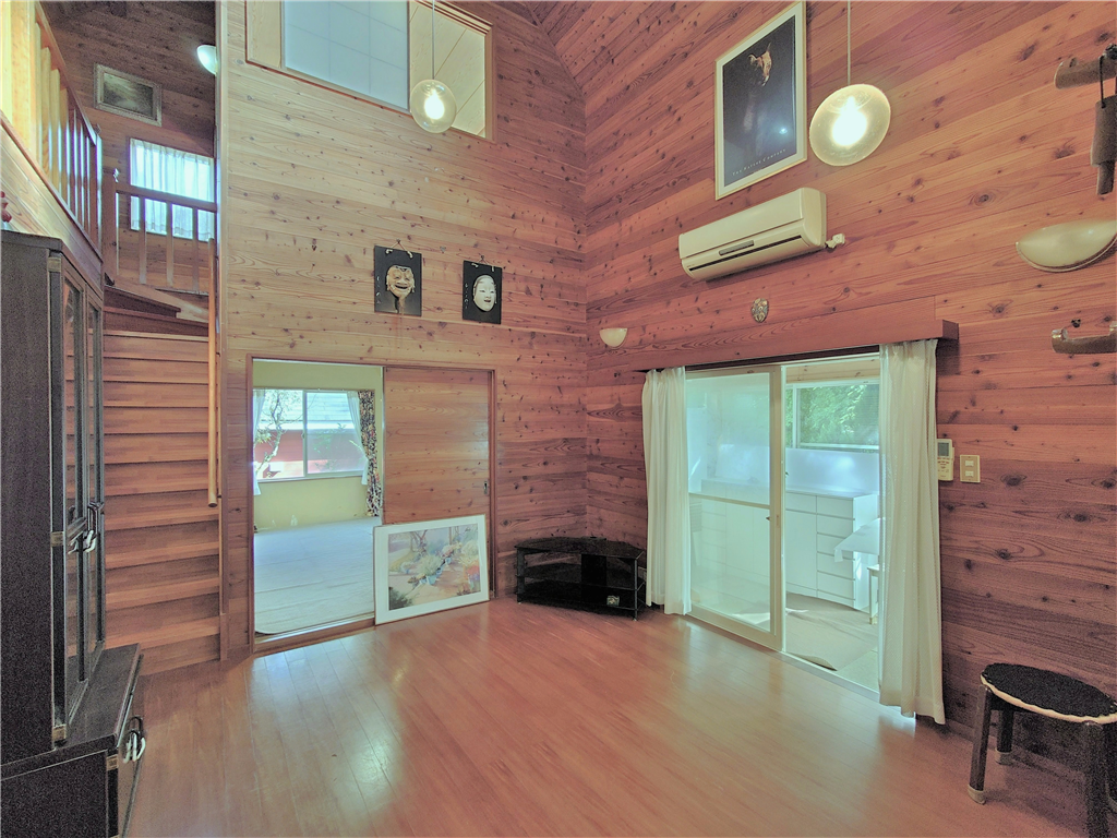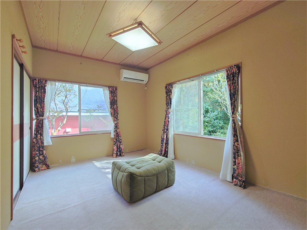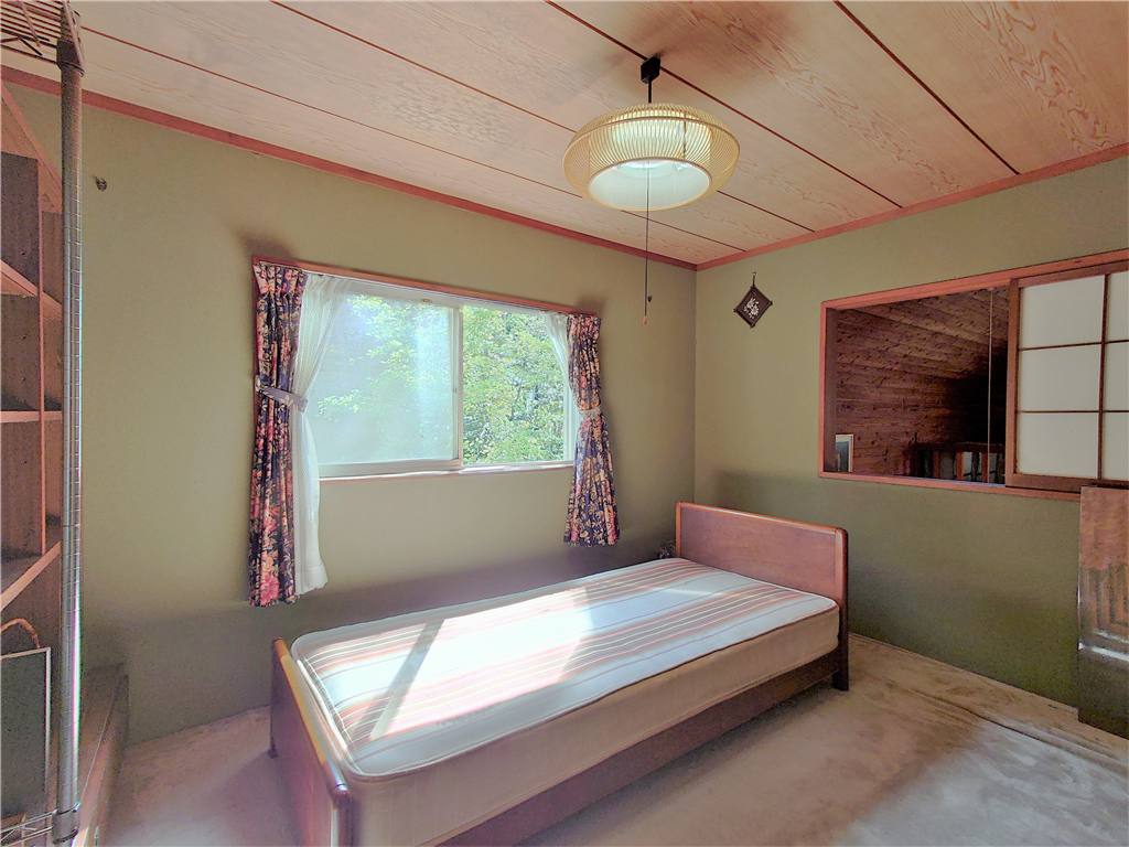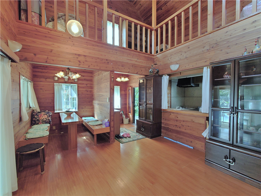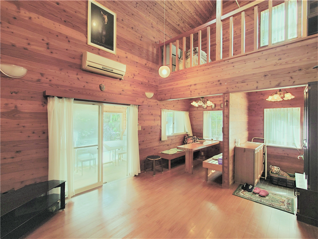 自然豊かで平坦な敷地に建ち、和室2部屋を有する木造建築の一戸建て別荘。