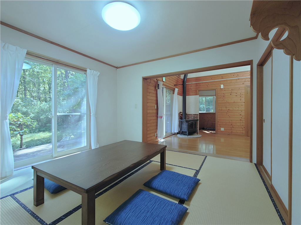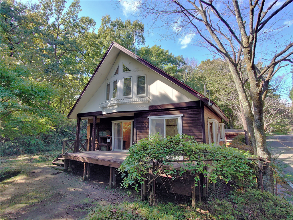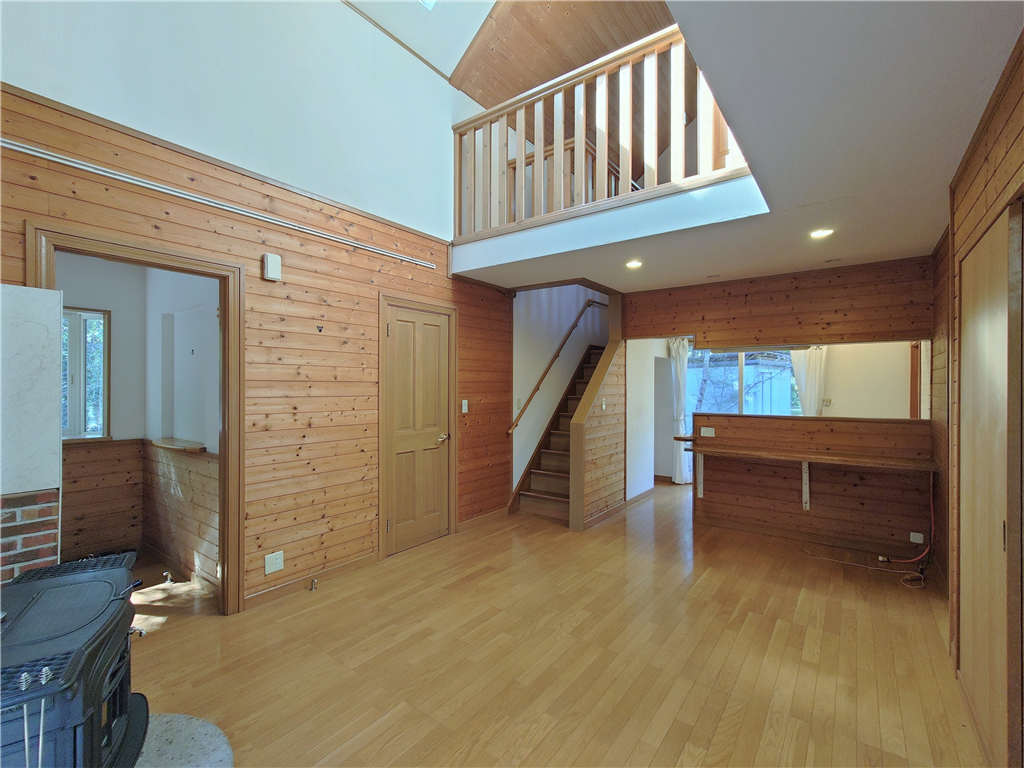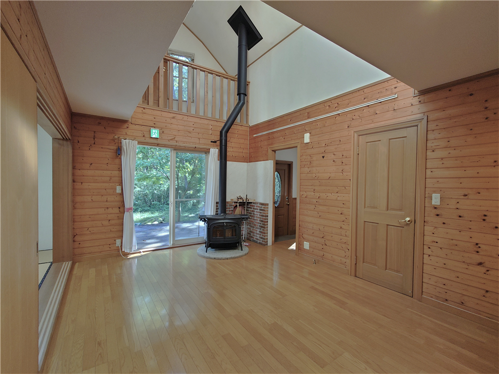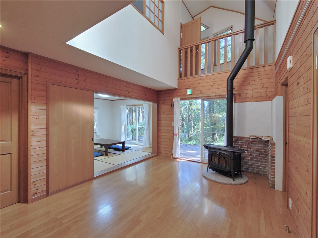 LDKに薪ストーブがあり、敷地内には薪小屋も設置された木造建築の一戸建て別荘です。