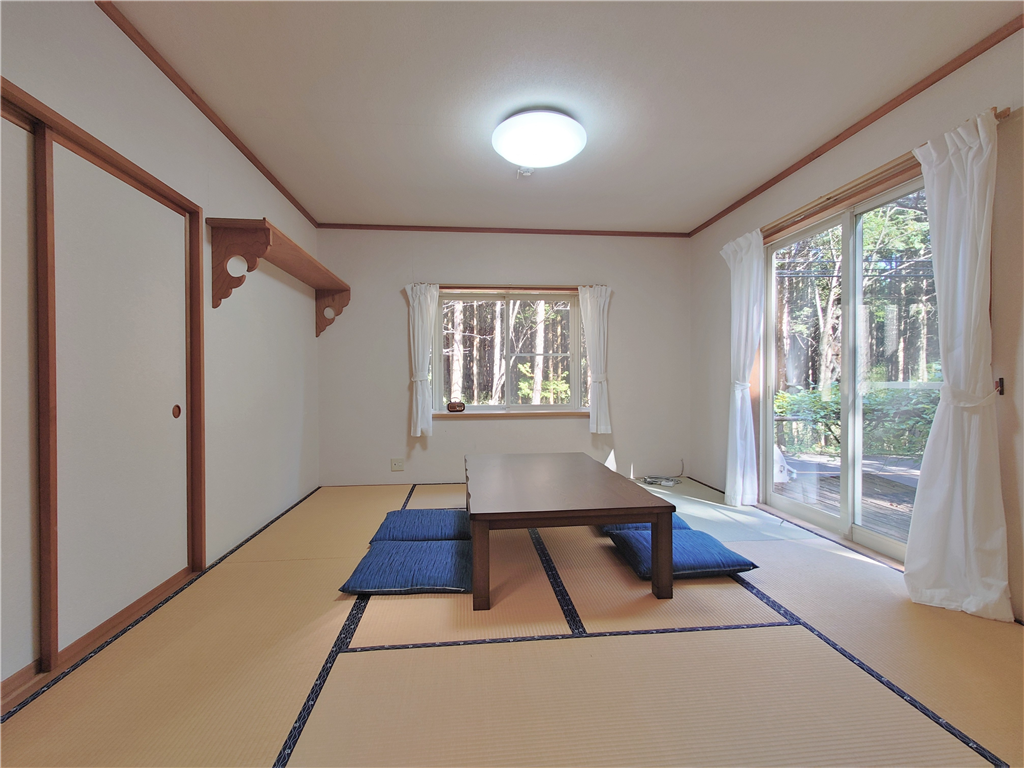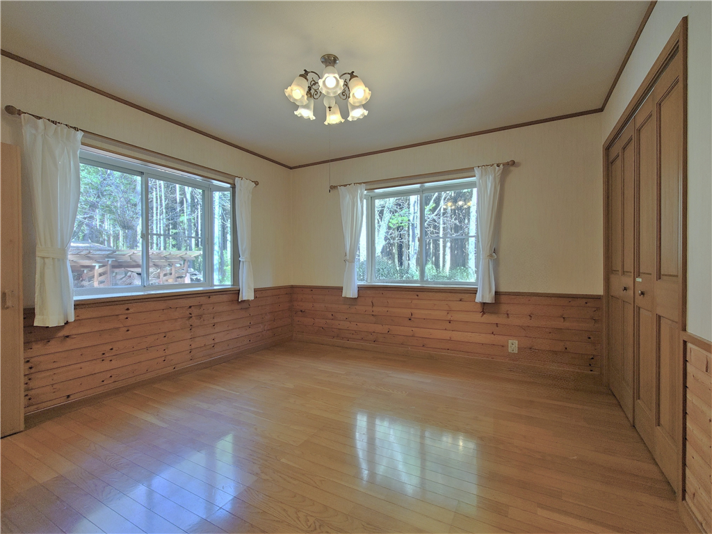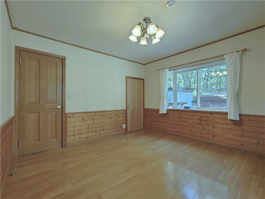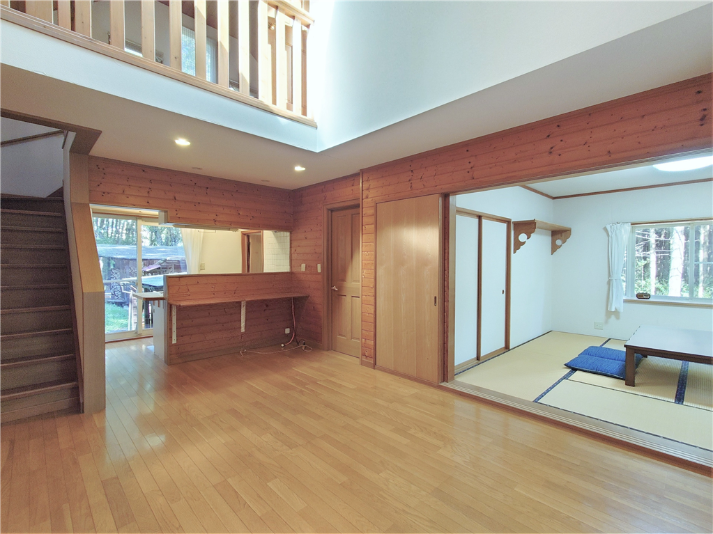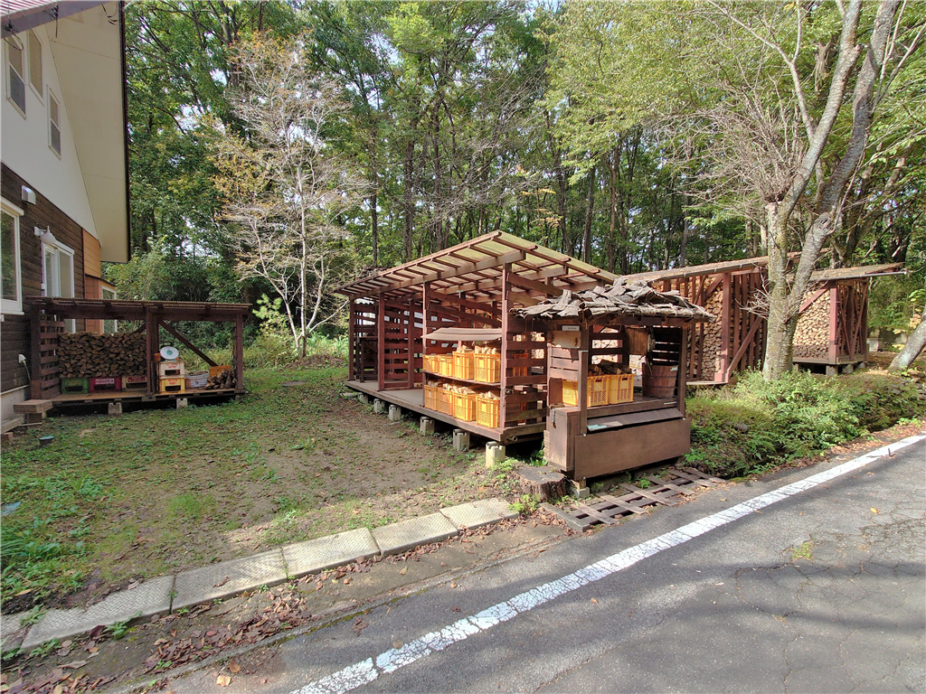 LDKに薪ストーブがあり、敷地内には薪小屋も設置された木造建築の一戸建て別荘です。