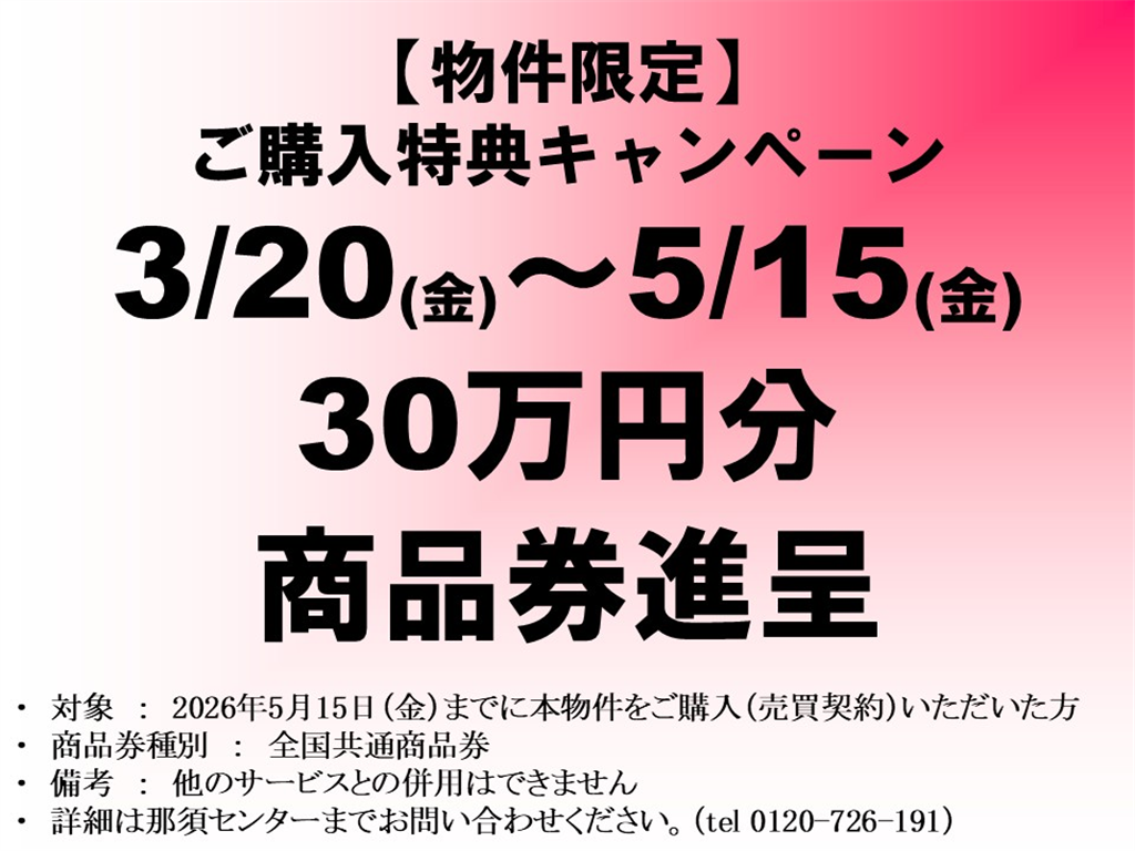 | 注記 | ※2026年4月以降の引渡となります。 ※家具・家電等はCGです。 ※リフォーム・補修等内容は別紙「リフォーム・補修等工事説明書」を参照ください(2026年2月28日完了)。 |