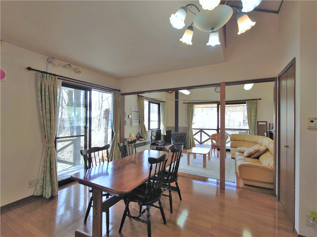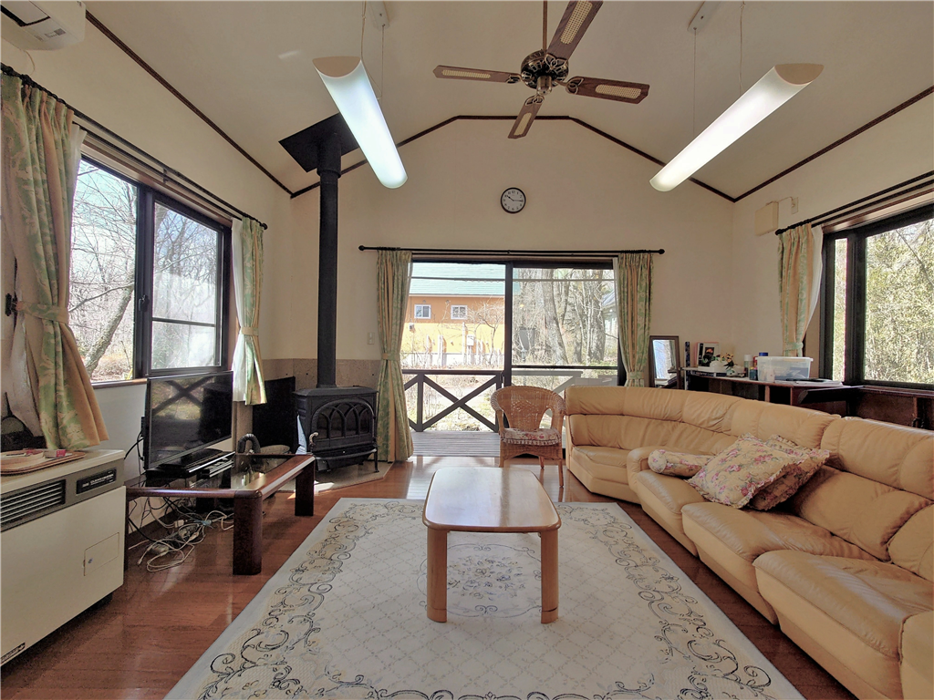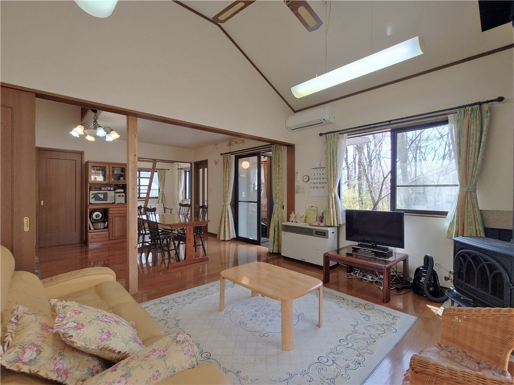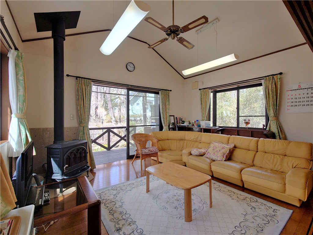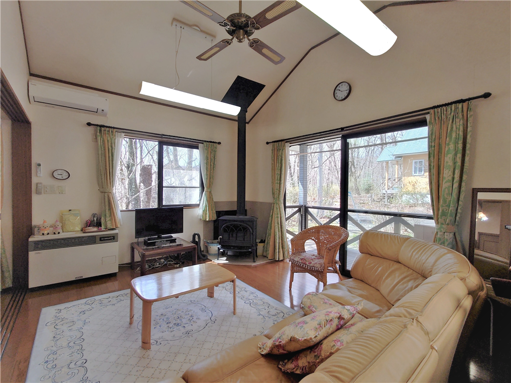平坦な敷地に建つ、リビングに薪ストーブのある木造建築の一戸建て別荘です。