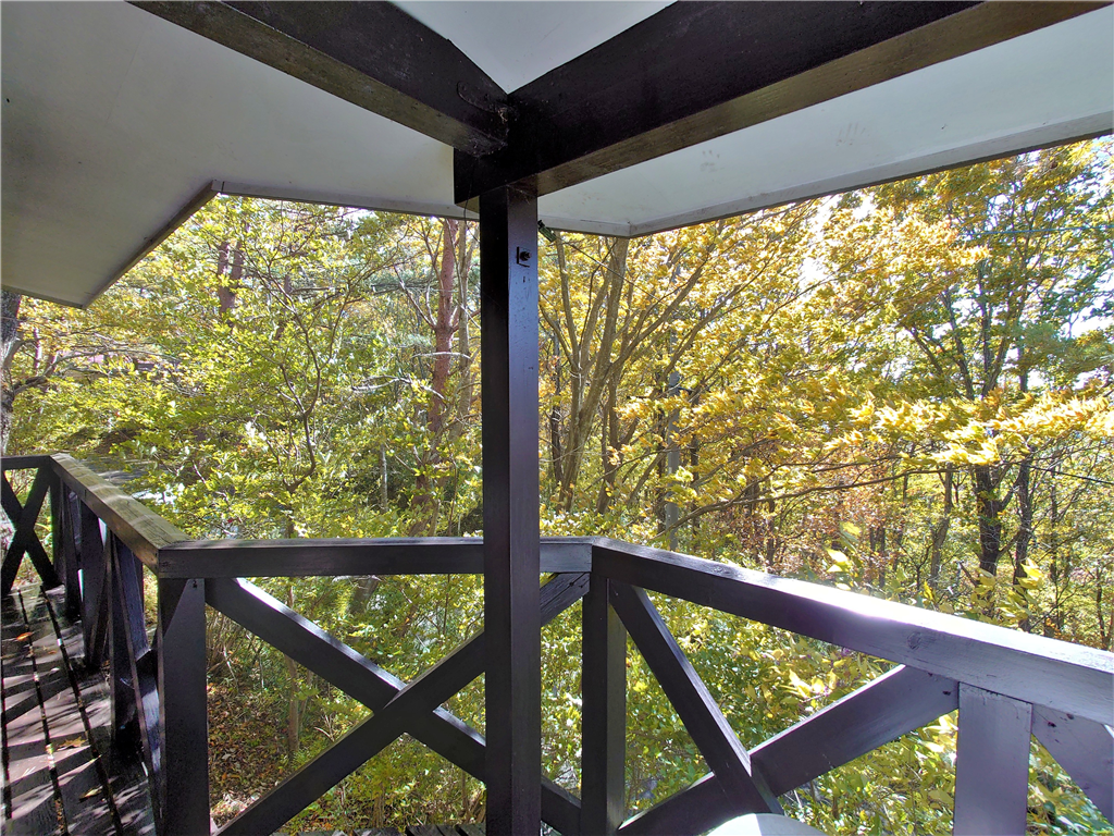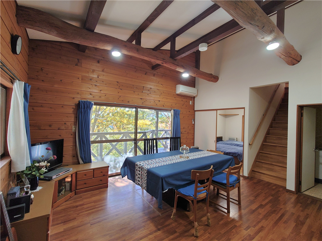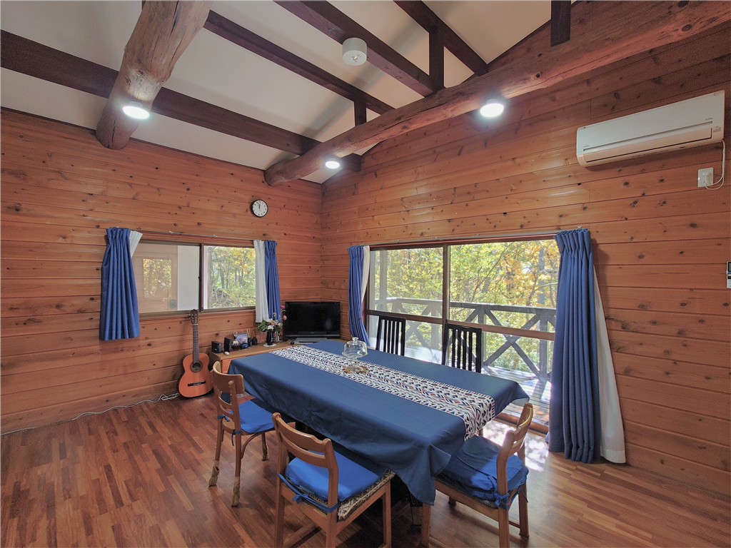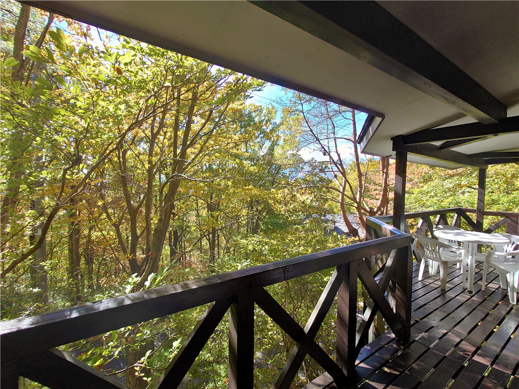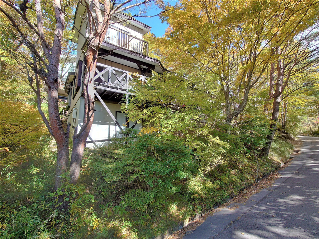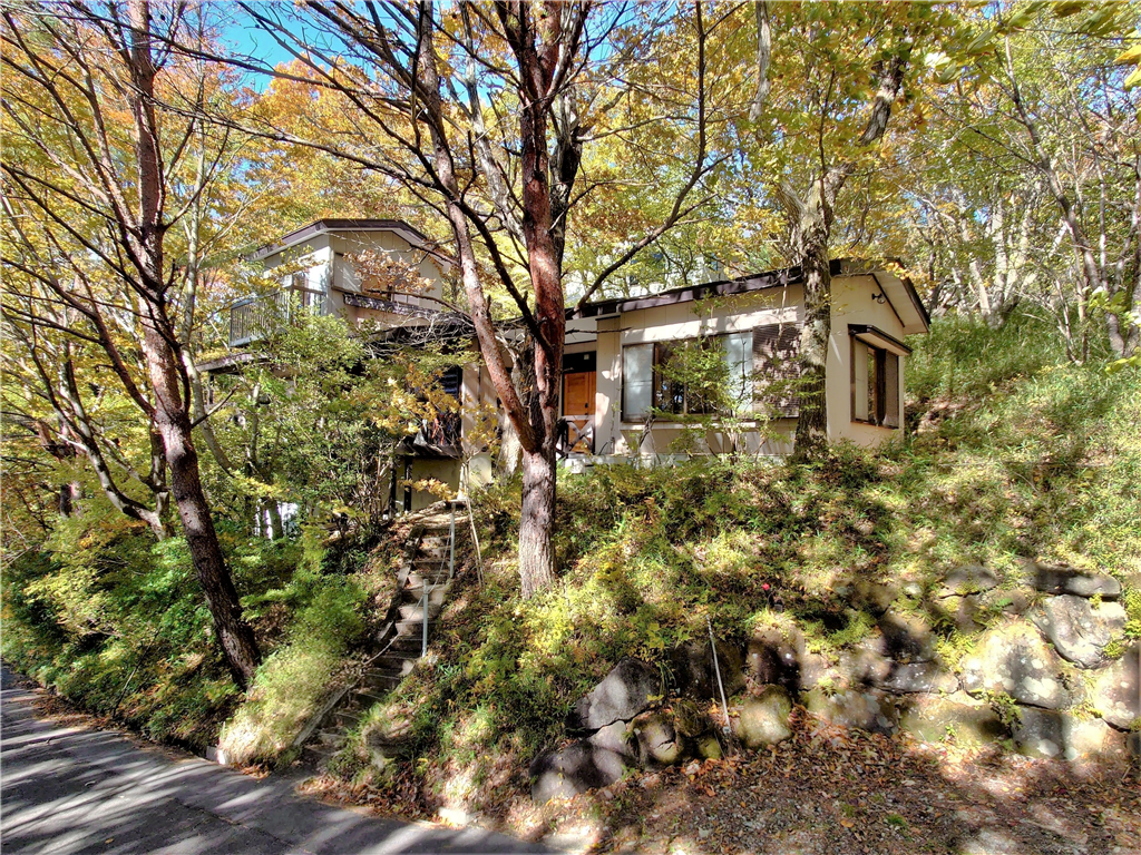 標高約728mに位置し、自然豊かな敷地に建つ木造建築の一戸建て別荘です。