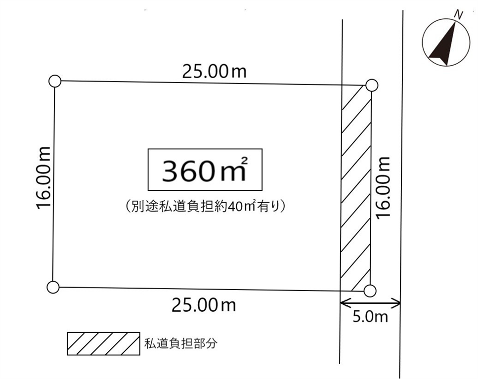 | 面積 | (公簿)360m2(108.90坪) 私道面積(別途負担)/40m2 | |