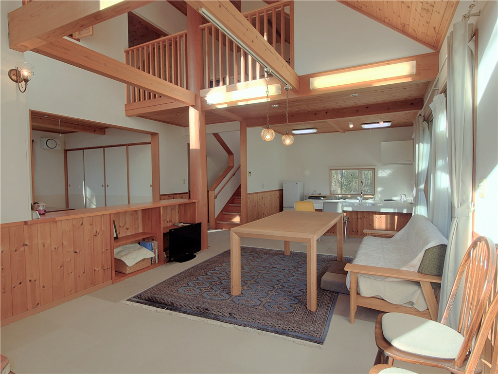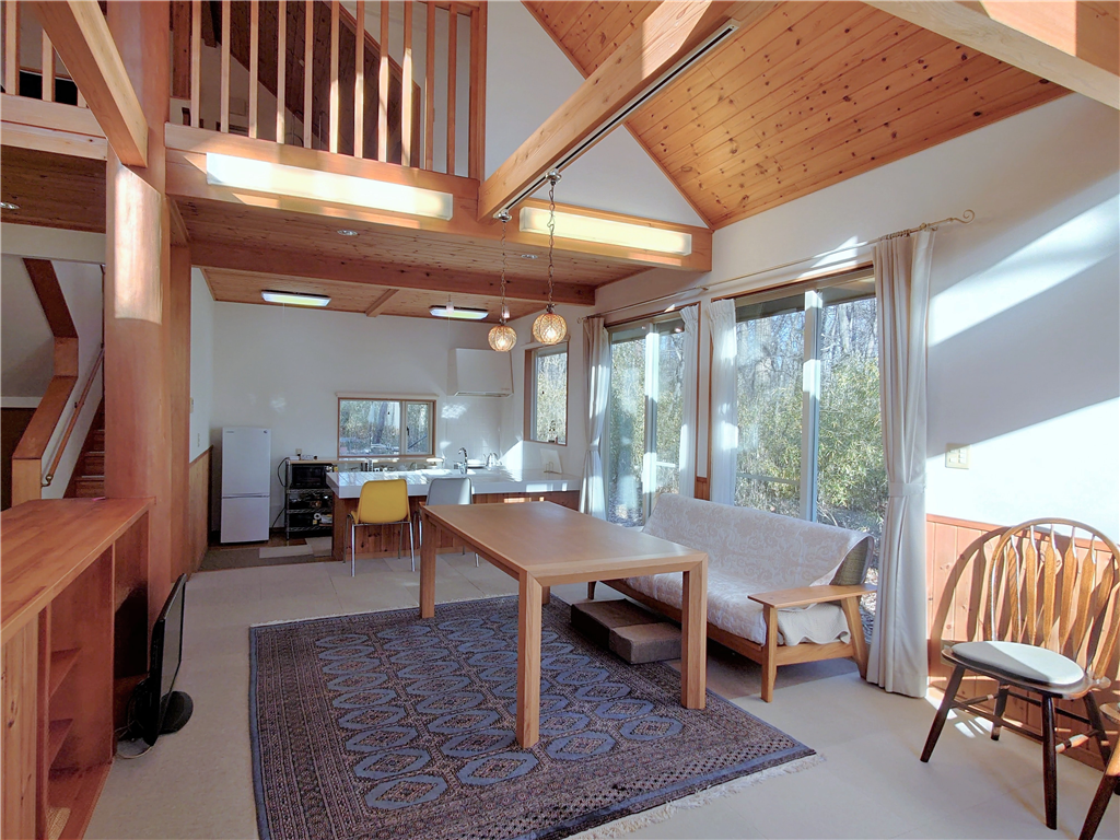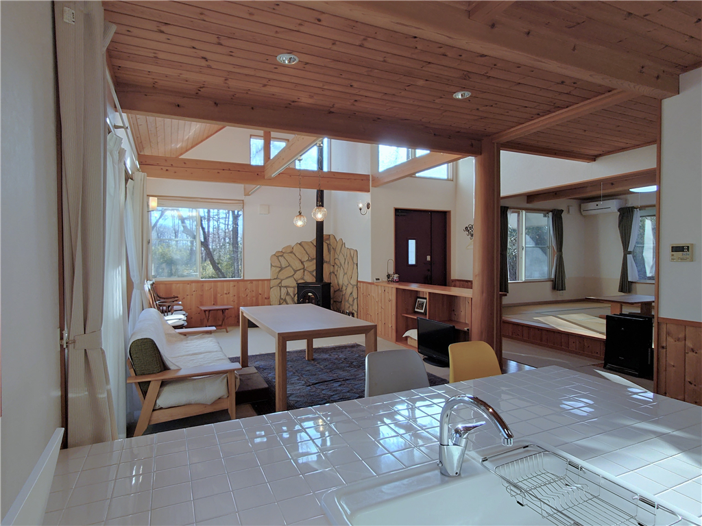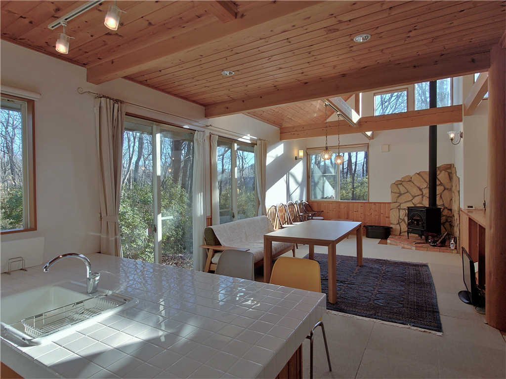 日当たりの良い南向き。勾配天井のLDKは明るく開放的で、薪ストーブも設置されております。