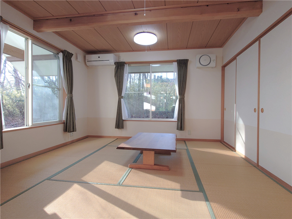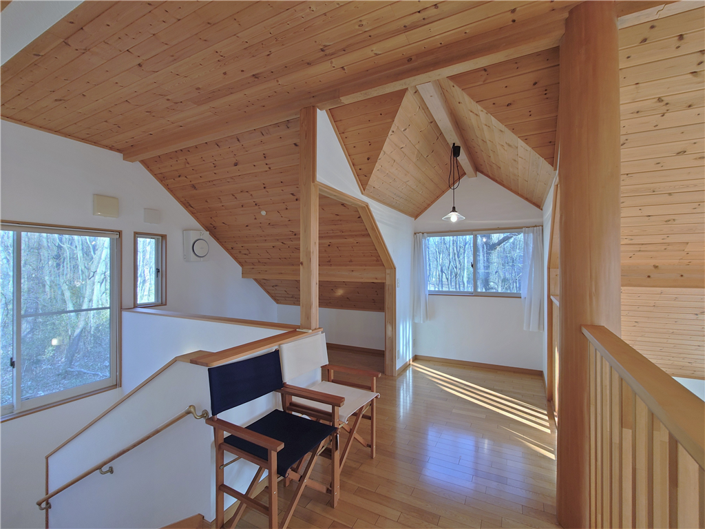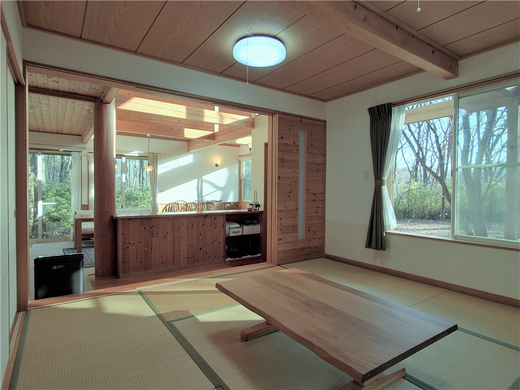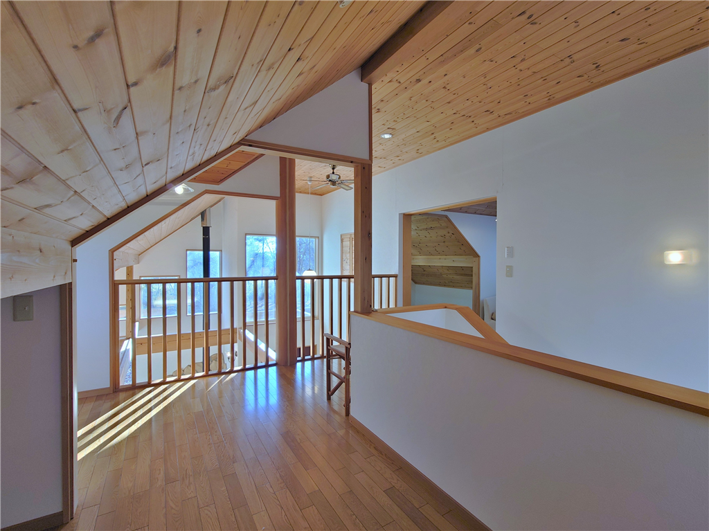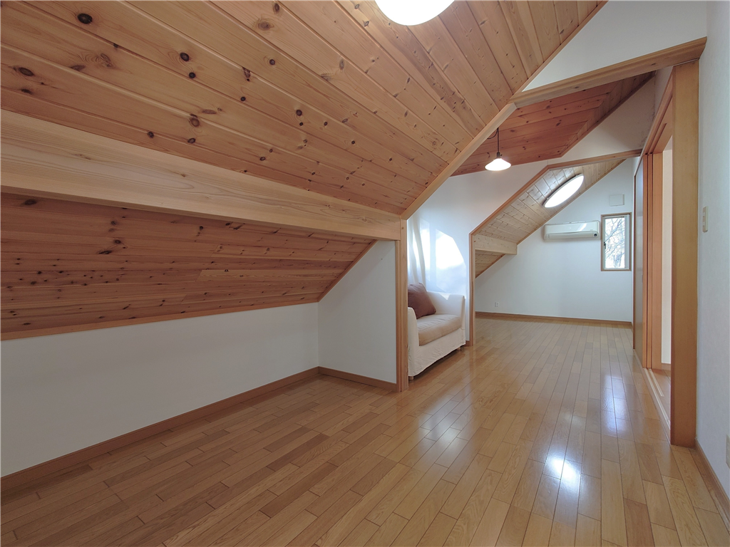 日当たりの良い南向き。勾配天井のLDKは明るく開放的で、薪ストーブも設置されております。