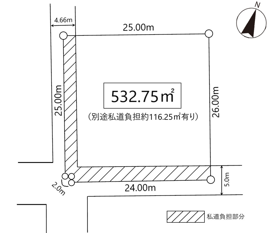 | 面積 | (公簿)532.75m2(161.15坪) 私道面積(別途負担)/116.25m2 | |