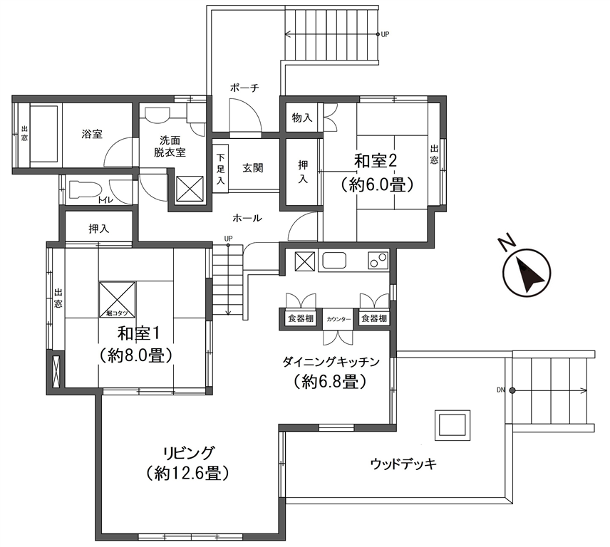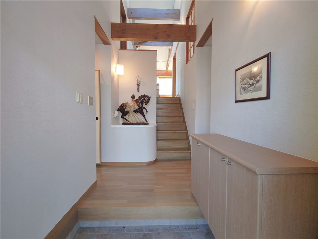 玄関ホールよりスキップフロアでLDKや和室のある、傾斜地の形状を生かした一戸建てです。