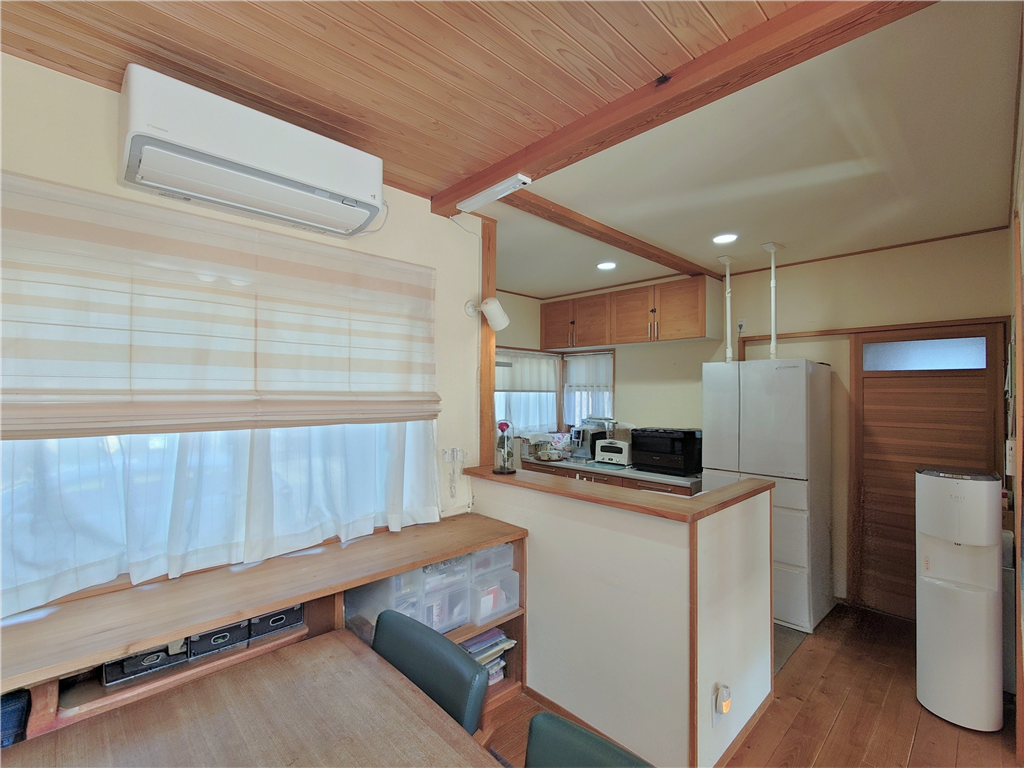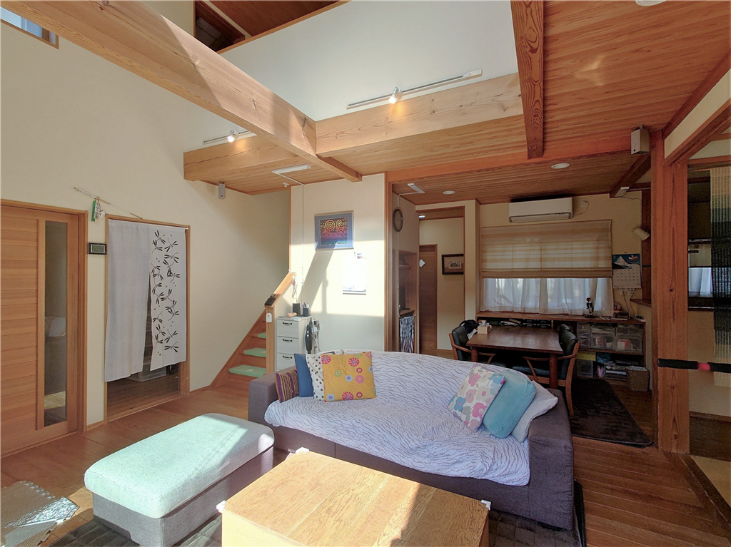 内壁には調湿性や給水性に好適な、珪藻土を使用し、床材には天然ヒノキの無垢材を使用した木造建築の一戸建て。